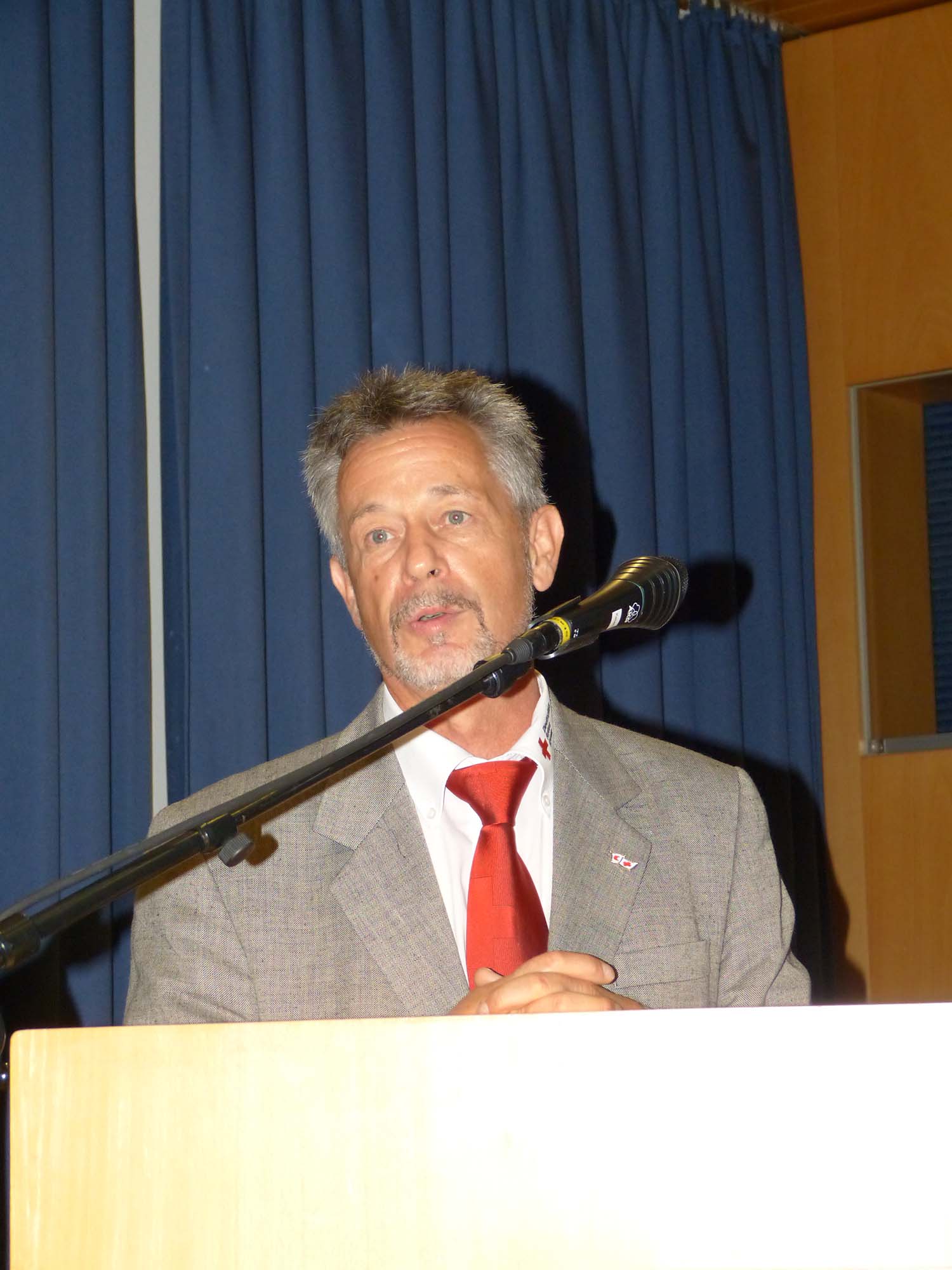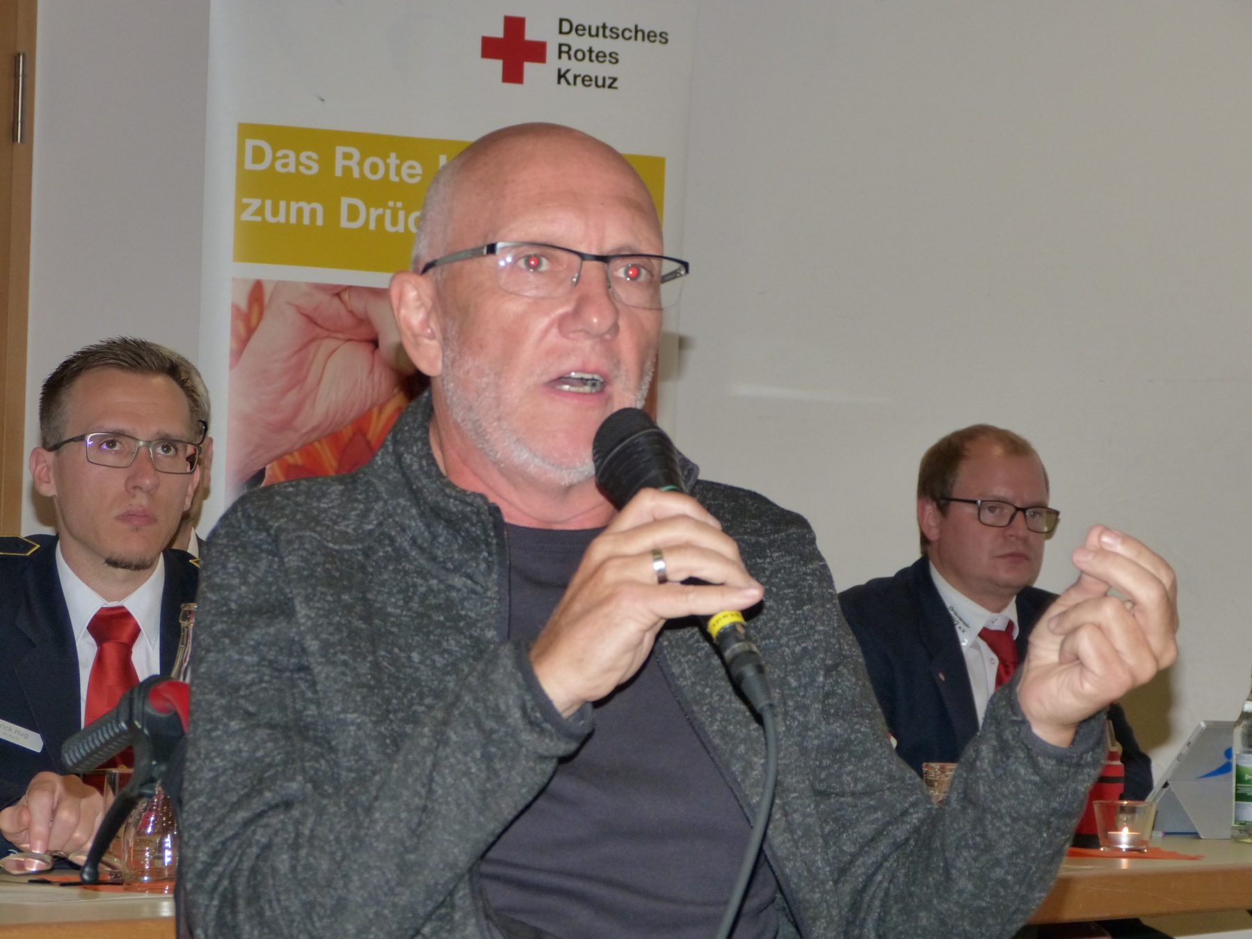 Ralf Greiner, jahrzehntelang leitender DRK-Notarzt, hielt ein, ob seiner schweren Erkrankung ergreifendes Plädoyer für die Werte der »DRK-Familie«.