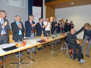 Obwohl inzwischen auf den Rollstuhl angewiesen, war auch Ralf Greiner zur Kreisversammlung erschienen. In einer eindrücklichen, sehr bewegenden Rede verabschiedete er sich von seiner »DRK-Familie«, denn aufgrund seiner Erkrankung wird der jahrzehntelang als leitender DRK-Notarzt tätig Gewesene sein Amt nicht mehr ausüben können. »Wir sollten Idealist bleiben und daran arbeiten, dass die Bedingungen für die Menschen sich verbessern«, gab er seinen Mitstreitern auf den Weg, »Mitleid ist eine unserer besten menschlichen Eigenschaften.« Ihm zu Ehren erhoben sich sämtliche im Saal Anwesenden, um lang anhaltenden Beifall zu spenden.