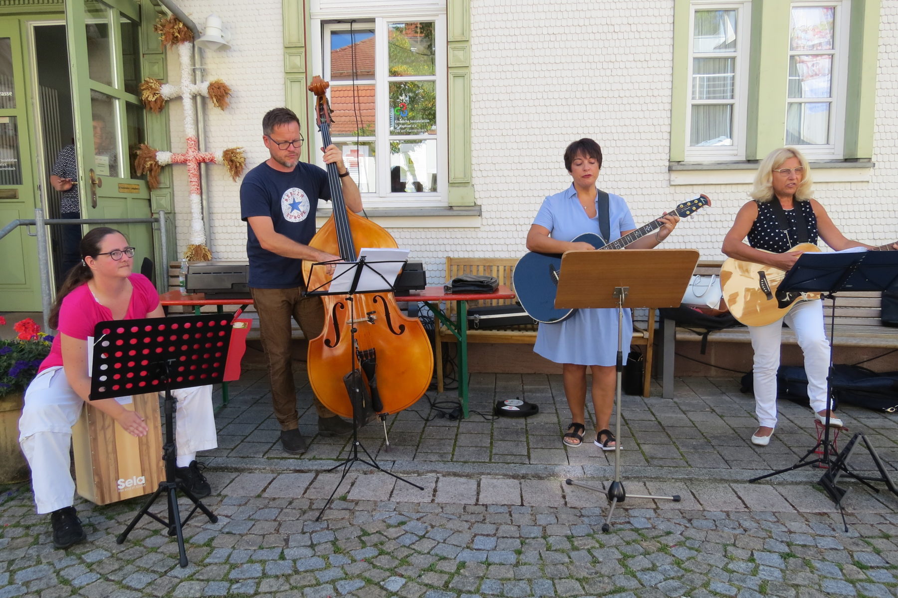 Die Gruppe Horizont zeigte mit ihrem Gesang, wie schön ihre Stimmen und Instrumente in der Kirche klingen können. Die Kirchenchöre der Seelsorgeeinheit bildeten zusammen mit dem evangelischen Kirchenchor eine große musikalische Gemeinschaft. Wolfram Dreher spielte die Orgelmusik. Die Stadtkapelle unter Leitung von Stefan Polap erfreute mit stimmungsvoller Blasmusik. Nach den Predigten erklang der Klassiker »I’m sailing«, ehemals von Rod Stewart gesungen. Den musikalischen Höhepunkt gelang der Stadtkapelle mit dem Abschlusslied »I will follow him« aus dem Film Sister Act. Die Kirchengemeinde klatschte gerne mit und wippte im Rhythmus des Taktes: Freude und Fröhlichkeit am Ende des Festgottesdienstes in der Pfarrkirche.