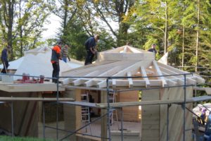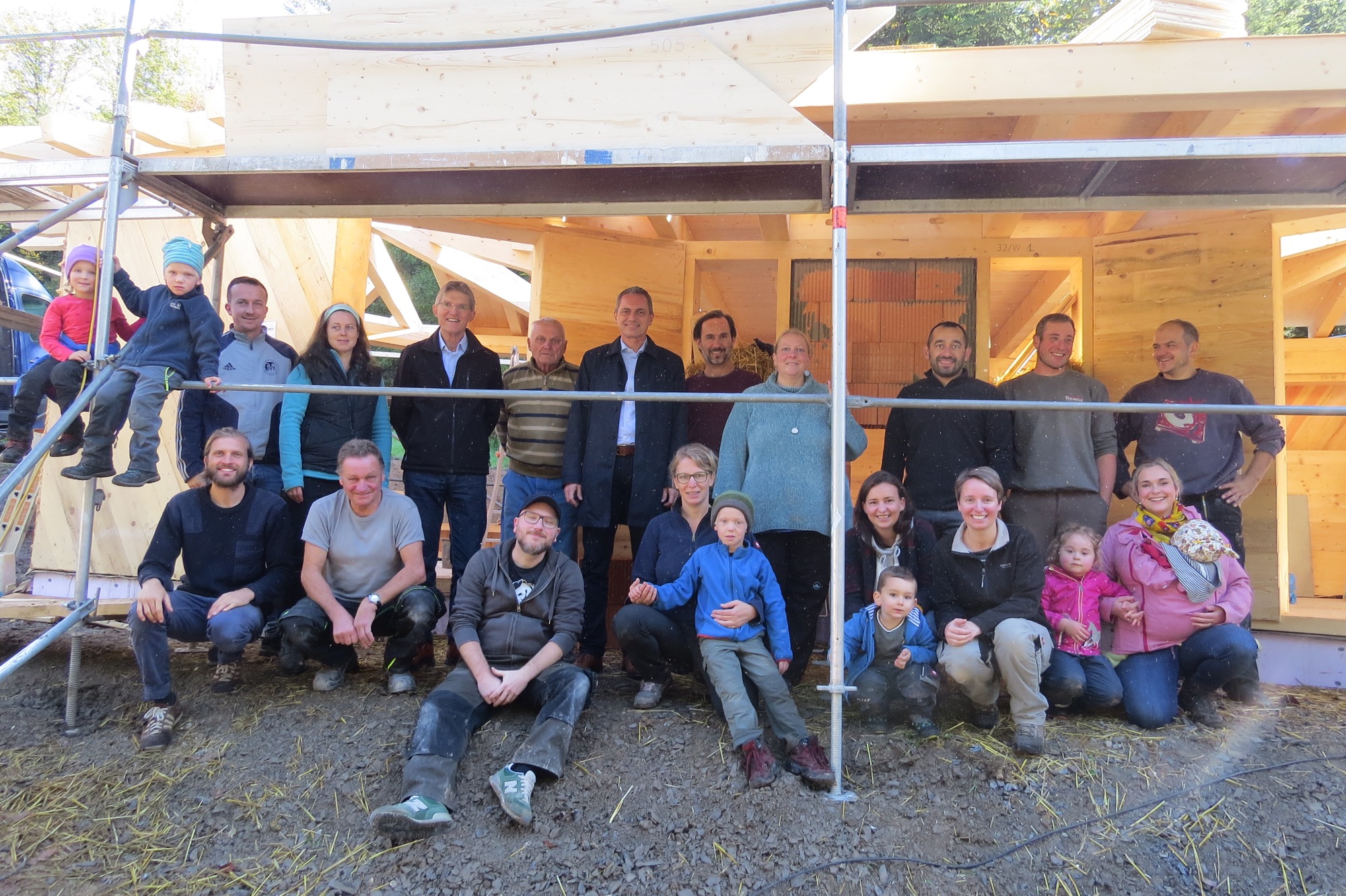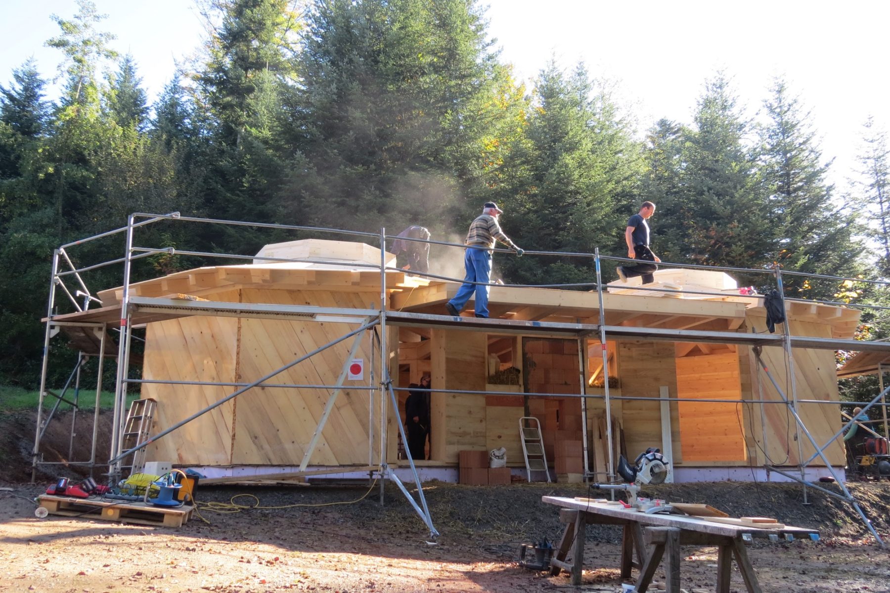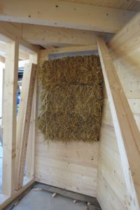 Am Freitagnachmittag und Samstag ist immer Großeinsatz mit den ehrenamtlichen Helfern. Am 3. Oktober hat der Bau begonnen und ist bis jetzt schon weit fortgeschritten, freute sich Heizmann. Gerne erklärt er die Bauweise der Schutzhütte. Die Hütte wird aus Holz von einheimischer Fichte und Tanne gebaut, Dämmmaterial ist Stroh. Es gibt zwei Gruppenräume mit eigenem Eingang und in der Mitte ein Verbindungsteil. Dort steht der Ofen – ein Küchenheizherd, der aus Sicherheitsgründen nur nach oben Wärme abgibt. Ein separater Ruheraum kann mit Matratzen ausgelegt werden.