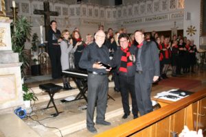 Im zweiten Teil wurden ehemalige Chormitglieder aus dem Publikum zum Mitsingen eingeladen. Eine ganze Reihe wagte den Schritt und verstärkten so den Chor u. a. um die Mitglieder, die wegen Grippe ausgefallen waren. Auf dem Programm standen Titel, die schon früher zum Repertoire gehörten. Bei »Amazing Grace« begeisterte Martina Pfundstein als Solistin mit ihrer glockenreinen Stimme, die keine Höhenangst kennt. Valérie Friedmann hat sie mit dem E-Piano behutsam begleitet. Auch das Spiritual Nobody Knows durfte beim Rückblick nicht fehlen.