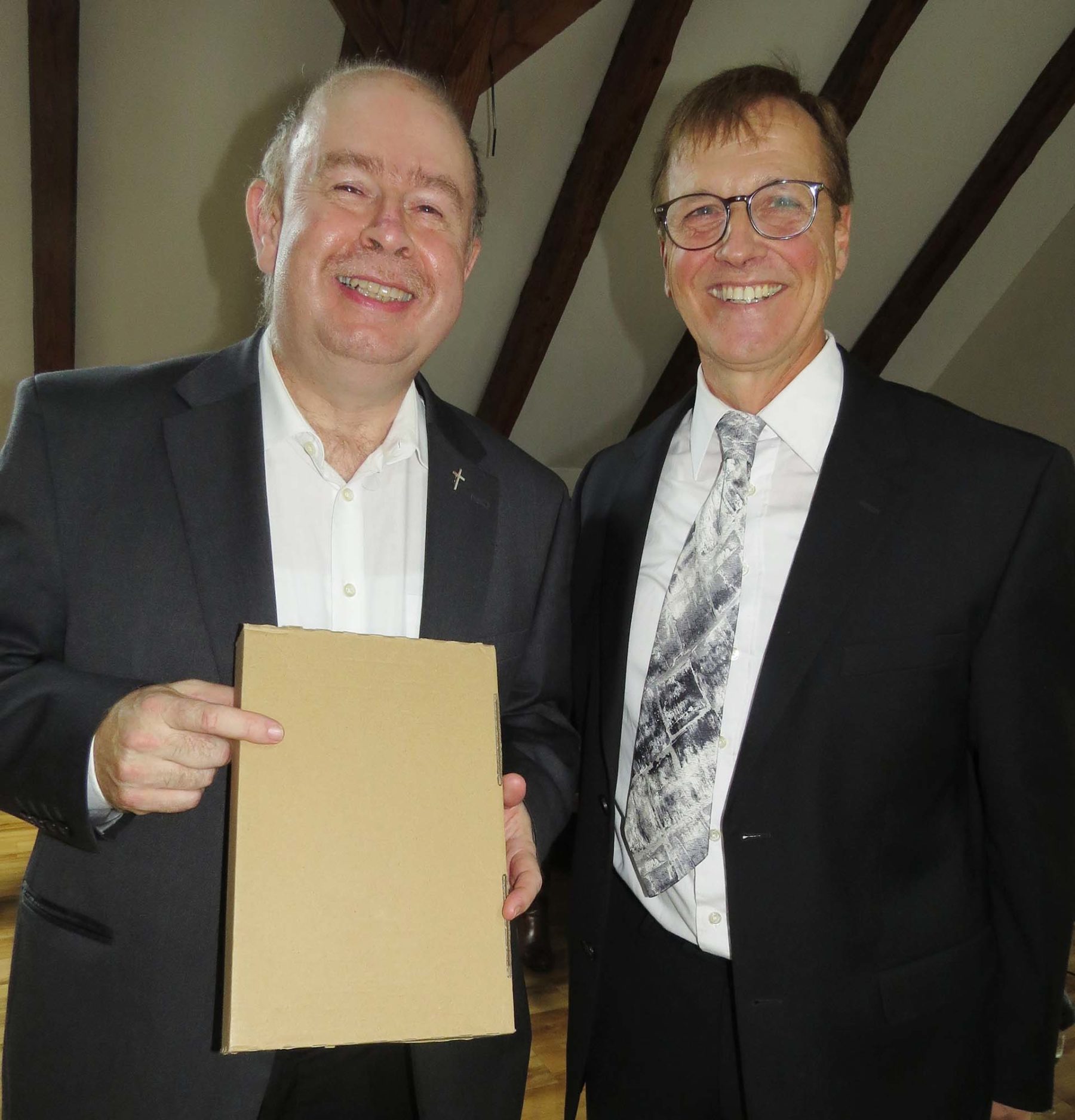 Pfarrer Reinhard Monninger von der evangelischen Kirchengemeinde hat Pfarrer Seibt bei der Organisation und Durchführung des ökumenischen Kirchentages kennengelernt. Er dankte ihm für die vertrauensvolle Zusammenarbeit und seine stets freundliche Art, auch in stressigen Situationen. Als Abschiedsgeschenk überreichte er ihm ein gläsernes Kreuz, das das Thema des Kirchentags darstellt »Jesus ist das Licht der Welt«. Das Kreuz funkelt in verschiedenen Farben. »Du bist eines der bunten Tupfer auf dem Kreuz«, erklärte Monninger.