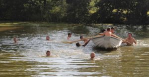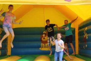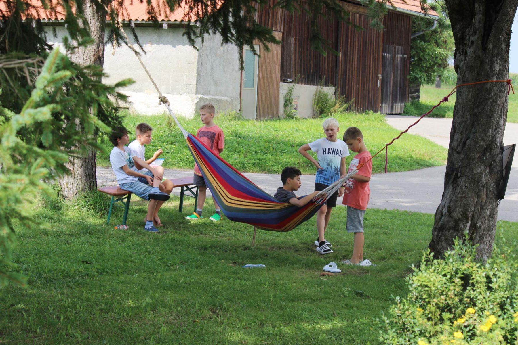 Aber auch gespielt wurde im Lager mehr als genug. Angefangen bei Gesellschaftsspielen bis hin zu Wasserspielen mit Wasserrutsche und Postenläufen. Bei Klein gegen Groß traten Kinder gegen Teamer an: Egal ob beim Wettrudern, beim Tischkicker oder beim Ertasten von Gegenständen – die Kinder gaben nicht auf und gewannen. Bei der 60-Minuten-Wette war dann Teamwork gefragt. Bei diesem Spiel bekam die Gesamtgruppe einige Aufgaben, die innerhalb von 60 Minuten gelöst werden mussten. Aufgaben waren beispielsweise das Durchnummerieren einer Klopapierrolle, Verkleiden, Witze erzählen und Schweigen für fünf Minuten. Letzteres war eine willkommene Abwechslung für die Betreuerinnen und Betreuer.