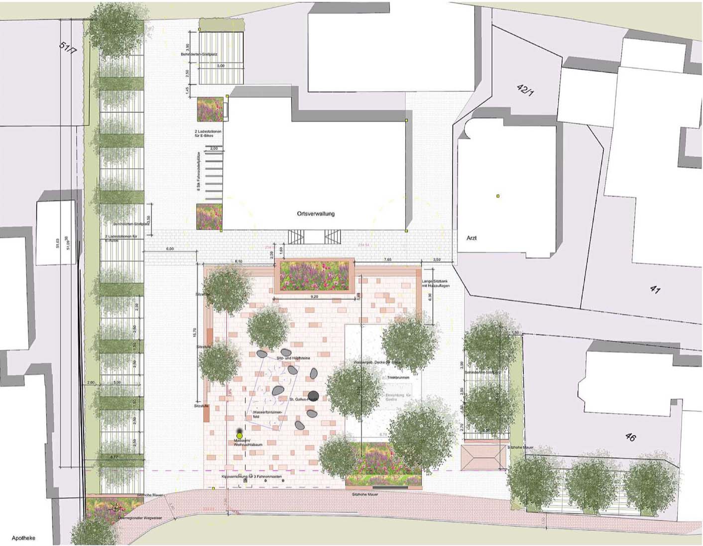 Die Planungen sehen im Zentrum des Platzes ein Wasserspiel oder einen Narrenbrunnen vor. Auch die Figur des Ortsheiligen St. Gallus soll wieder in die Anlage integriert werden. Für den ruhenden Verkehr werden 25 Stellplätze ausgewiesen, drei davon sind Behindertenparkplätze. Auch Ladeplätze für E-Bikes und E-Autos sind vorgesehen.