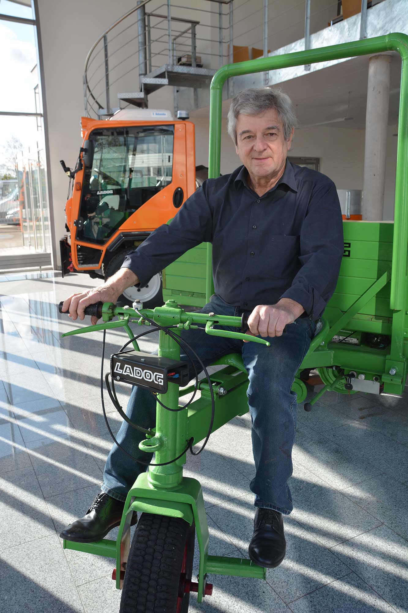 Mit Stolz nimmt Unternehmer Walter Guggenbühler auf einem Dreirad-Ladog Platz. Viele Hundert dieser Arbeitsfahrzeuge wurden gebaut und sind auch heute noch im Einsatz. Morgen kann der erfolgreiche Nordracher Unternehmer seinen 70. Geburtstag feiern. Foto: Hanspeter Schwendemann