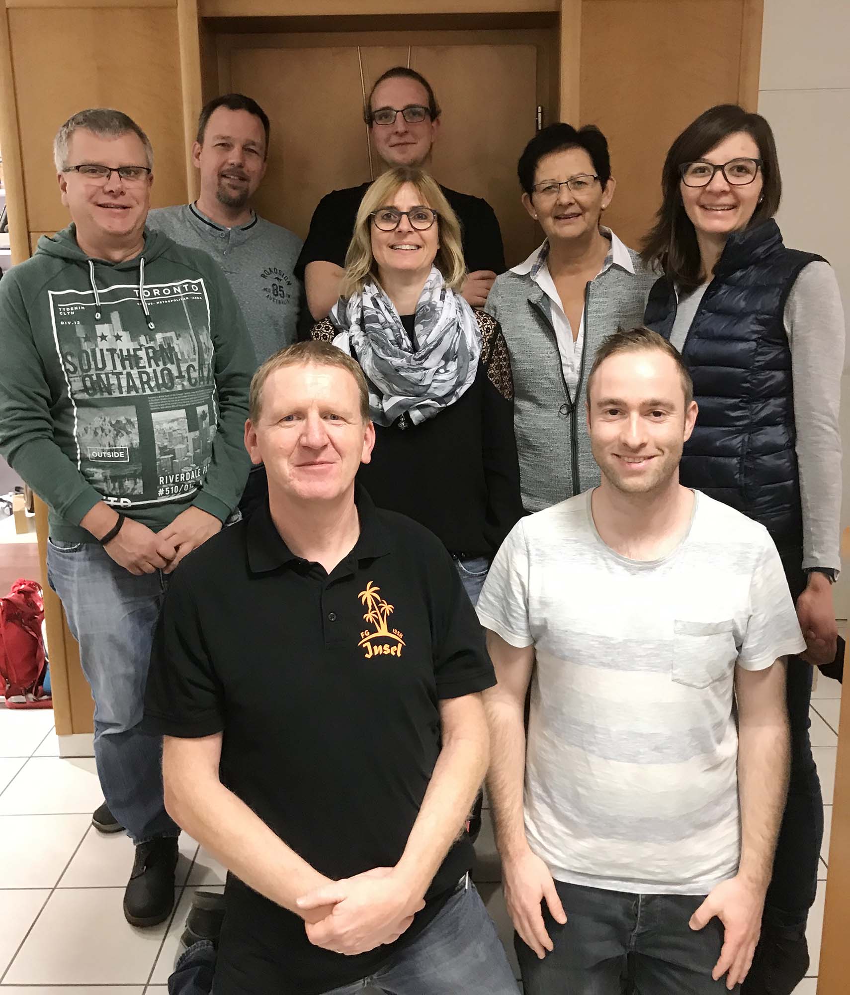 Olaf Krieg, Florian Hiss (vorne, immer von links nach rechts), Markus Öhler, Caterina Lechner, Jutta Schmid, Simone Schmid (Mitte), Frank Huber, Jonas Suhm (hinten) bilden mit Ralf Brüderle, Dietmar Schmid und Sabine Birk (nicht im Bild) das Führungsteam der Fasendgemeinschaft Insel. Foto: Verein