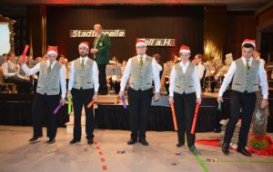 Ein besonderes Türchen hatten sich Dirigent Stefan Polap und die Stadtkapelle für den Zugabeteil aufgehoben. Mit dem Traumschiff ging es auf die musikalische Reise, bei der Martin Harter und Birgit Maier als weitere Solisten des Konzertabends glänzten. Ganz in Traumschiff-Manier wurde am Ende vom »Bordpersonal« Überraschungstorten mit sprühenden Fontänen aufgetragen und an die Ehrengäste in der ersten Reihe verteilt. In den stimmungsvollen Genuss zum Finale kamen dann wieder alle Gäste. Die Stadtkapelle und der Chor der Zuhörer stimmte »O du fröhliche« an und ließen sich damit auf die Weihnachtszeit einstimmen. Alle gemeinsam freuten sich über das großartige musikalische Weihnachtsgeschenk, das die Stadtkapelle ihren Gästen bereitet hatte.