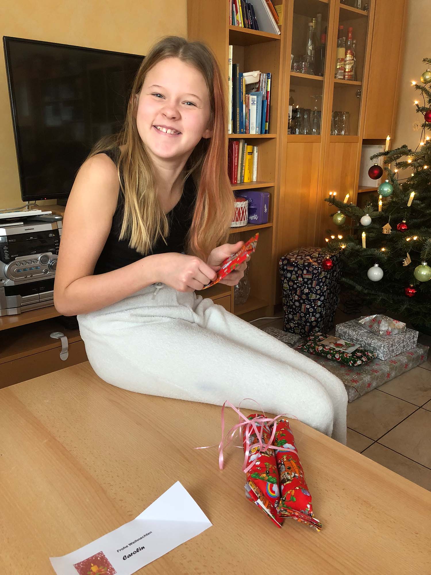 Carolin freut sich über ihre Geschenke. Bescherung ist bei der Familie Polap ganz entspannt am Morgen des 1. Weihnachtsfeiertags.