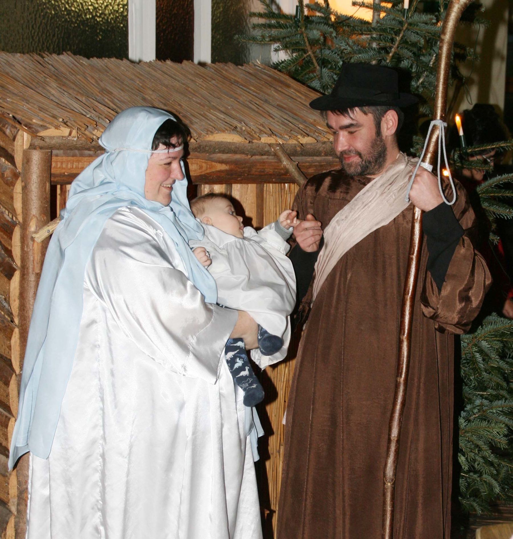 Wie alljährlich stand die Krippenfeier im Mittelpunkt. Auch diesmal war es wieder gelungen ein »lebendes Jesuskind« zu finden. »Maria« trug es bei der Herbergsuche auf ihren Armen. Für Stefanie Fritsch war es bereits das 14. Mal, dass sie in die Rolle der Mutter Jesu schlüpfte. Und auch Daniel Mahler war zum 11. Mal als »Joseph« unterwegs.