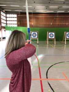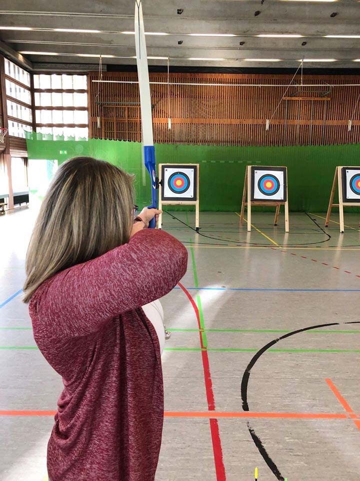 In einer kurzen Pause zeigte Sabine Herm ihren olympischen Recurve-Bogen, bevor man mit einem kleinen Turnier begann. Nun konnte man das Gelernte umsetzten. Es wurden zwei Mannschaften gebildet und schon war man im Wettkampfmodus.