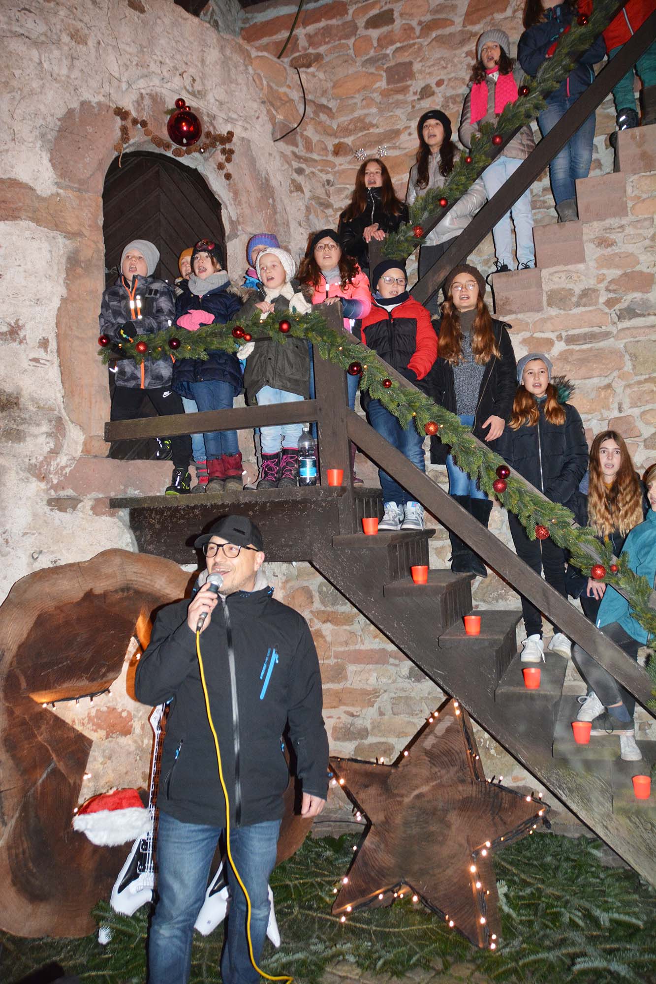 Später am Abend traten dann die Sängerinnen und Sänger des Gesangvereins »Frohsinn« auf und sorgten für eine besinnliche Stimmung. Kaum stimmte der Chor seine ersten Lieder an, wurde es mucksmäuschenstill auf dem Platz beim Hirschturm und alle lauschten aufmerksam den Lieder des Traditionsvereins. »Stille Nacht, heilige Nacht…« selten waren die Textzeilen so zutreffend.