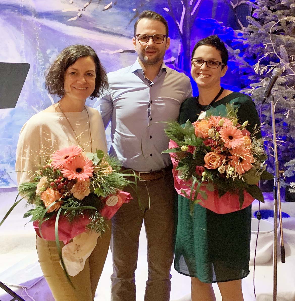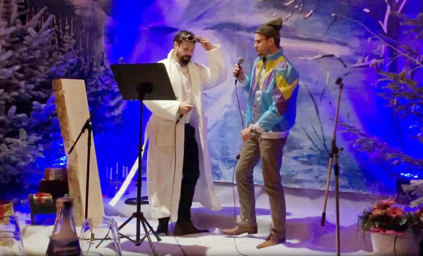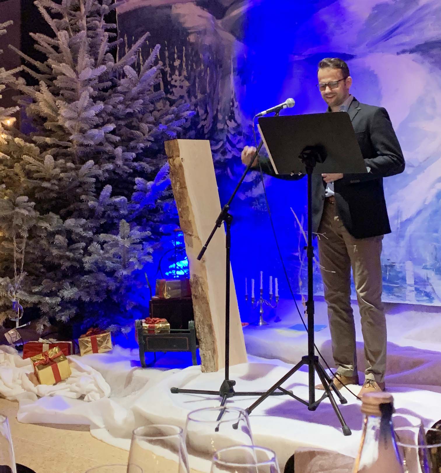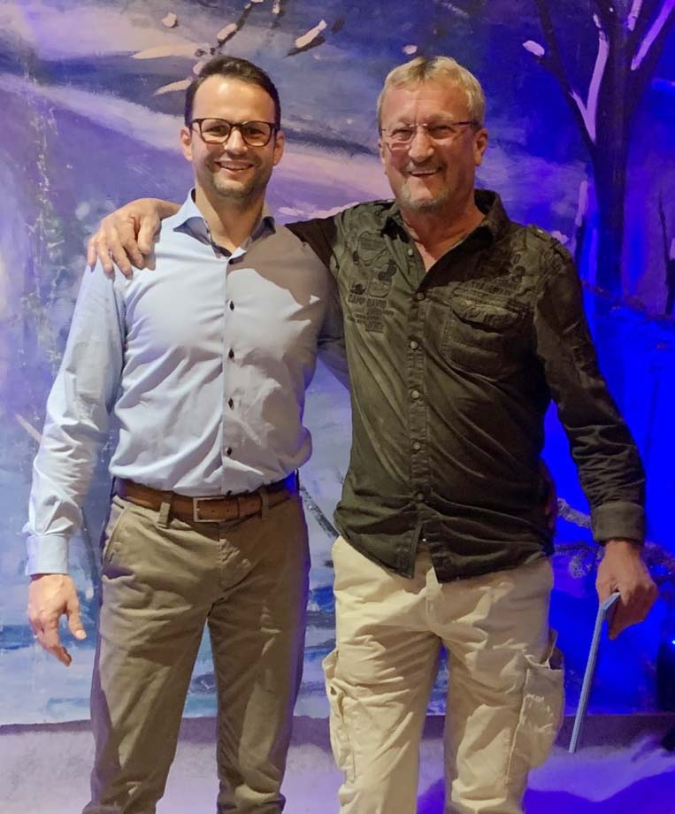 Einen weiteren Höhepunkt des Abends boten Stefan und Michael Lehmann. Mit ihrem Rapp »Ich und mein Holz« brachten sie ihre Leidenschaft zum Werkstoff Holz zum Ausdruck und wurden von den Gästen mit Standing Ovations gefeiert. Als spezielles Weihnachtsgeschenk überreichten sie der Betriebsgemeinschaft ein Hüttenwochenende. Außerdem erhielten stellvertretend zwei Partnerinnen von Mitarbeitern einen Blumenstrauß. Damit brachten Stefan und Michael Lehmann zum Ausdruck, dass im Unternehmen nicht nur erfolgreich gearbeitet sondern auch gerne gefeiert wird: »Innenausbau Manfred Lehmann ist eine echt starke Betriebsgemeinschaft!«