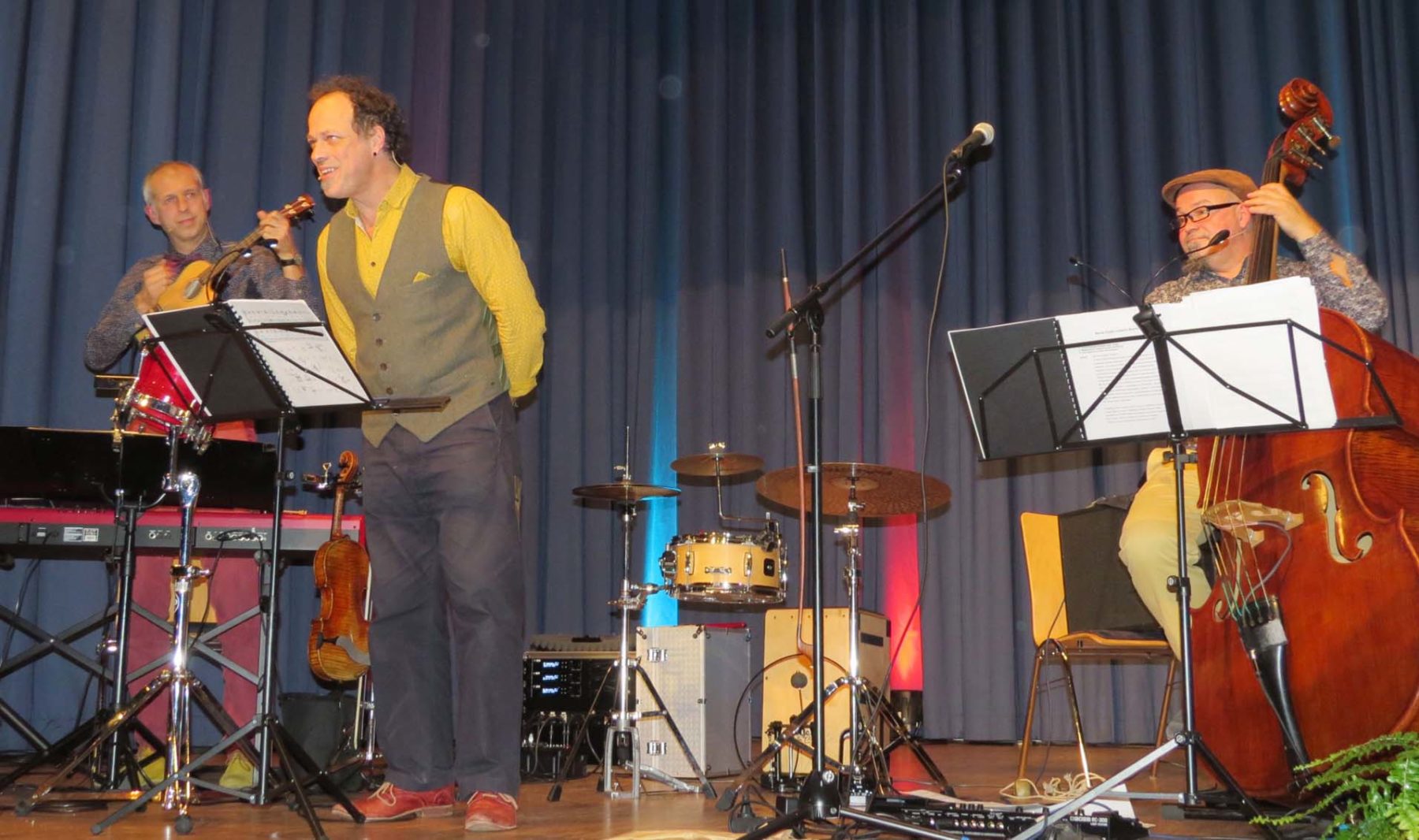 Bobby Fischer, Veit Hübner und Gregor Hübner präsentierten sich versiert an mehreren Instrumenten: Der Keyboarder kann auch Schlagzeug und Gesang; der Kontrabass Spieler kann auch Singen und Dichten und Gregor Hübner zeigte sich als Multitalent. Er wechselte zwischen Geige, Keyboard, Schlagzeug und Percussion und überzeugte als begnadeter Sänger.