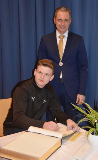 Foto: Hanspeter SchwendemannDer erfolgreiche Jugendkegler des Kegelvereins Unterharmersbach erhielt nicht nur Ehrenmedaille und Urkunde, sondern durfte sich als Weltpokalsieger auch in das goldene Buch der Stadt Zell eintragen. Bürgermeister Günter Pfundstein erinnerte daran, dass seine Schwester Bianca Zimmermann – ebenfalls mit einem Jugend-Weltmeistertitel in der Tasche – die erste war, die sich in das goldene Buch der Stadt Zell eintragen durfte.