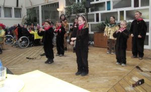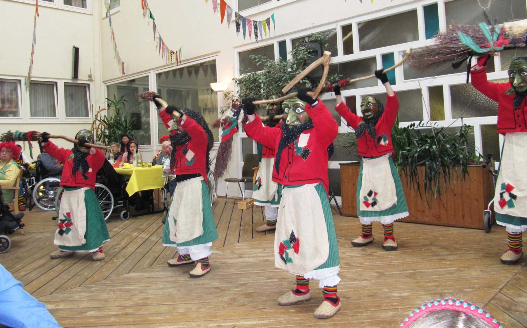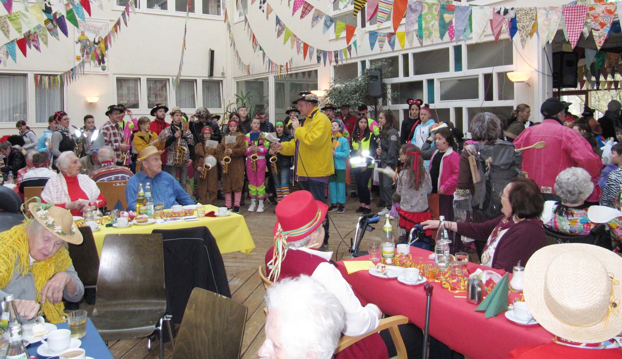 Gestern Nachmittag hatte die Heimleitung die Bewohner des Pflegeheims und des Betreuten Wohnens zu einem närrischen Nachmittag eingeladen. Rund 100 Bewohnerinnen und Bewohner folgten dieser Einladung zu Unterhaltung mit Kaffee, Kuchen und Fasendskiechle im Foyer und lichten Innenhof.