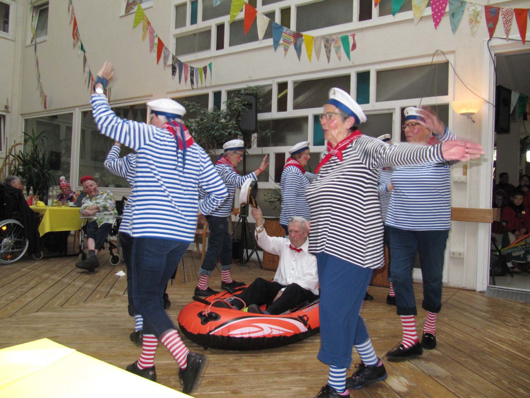 Aber auch Seniorinnen und Senioren des Zeller Altenwerks machten den Heimbewohnern ihre Aufwartung. Brigitte Armbruster stellte mit ihrer Gymnastikgruppe unter Beweis, dass man auch mit vielen Lenzen im Gepäck sich noch munter bewegen kann. Manfred Neumayer war bei den Damen diesmal nicht der Hahn im Korb, sondern der Kapitän im »knallroten Gummiboot«. Der gleichnamige fetzige Schlager gab für den beschwingten Tanz den Takt vor.