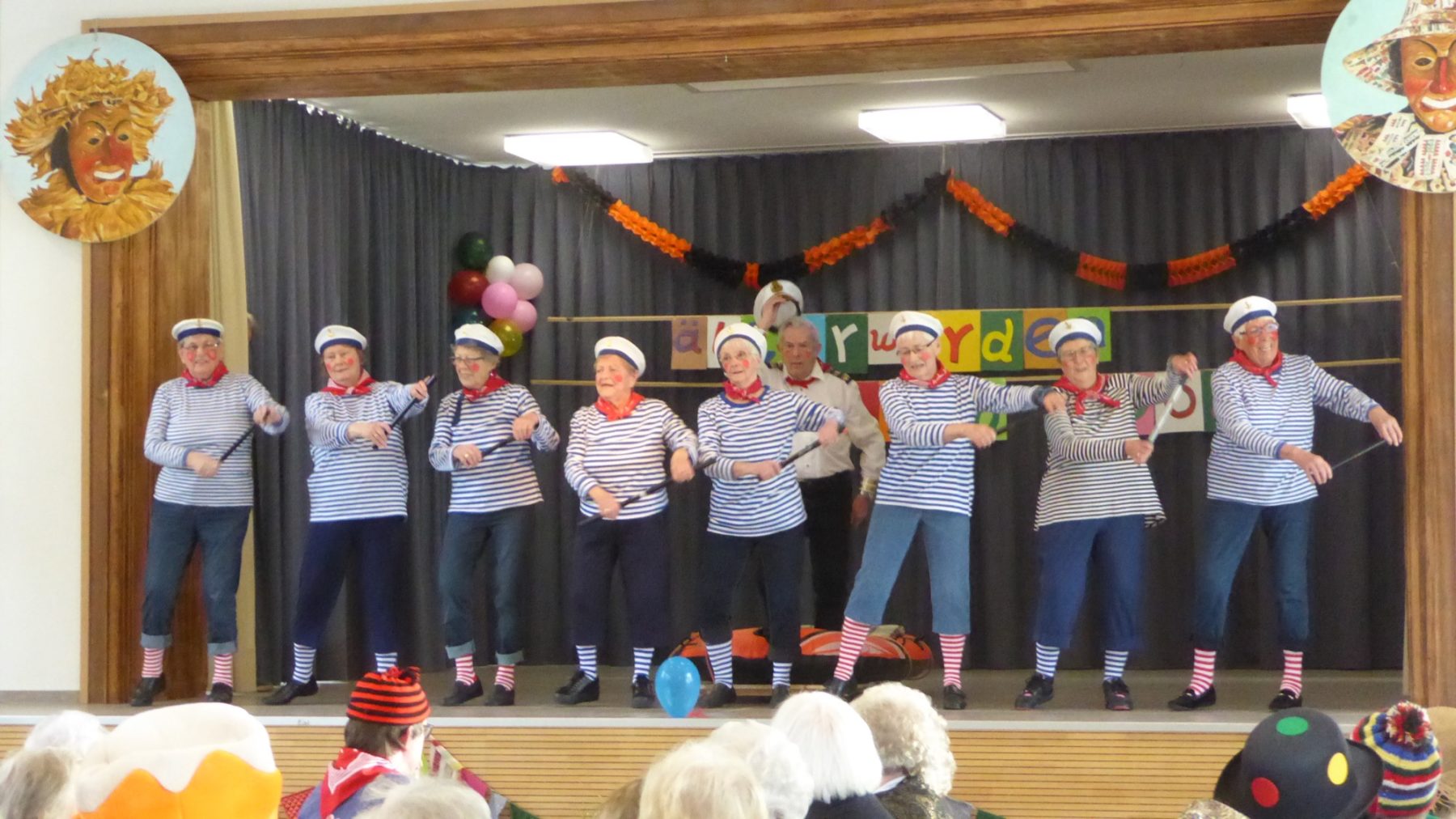 Bevor der nächste Programmpunkt folgte, sangen die Seniorinnen und Senioren den Zeller Narrenmarsch. Zum Musiktitel »Er hat ein knallrotes Gummiboot« boten acht Frauen der Seniorengymnastikgruppe unter der Regie von Brigitte Armbruster einen schwungvollen und originellen Tanz auf der Bühne dar. Natürlich durfte das Gummiboot nicht fehlen, in dem der einzige Mann der Tanzgruppe saß, der die als Matrosinnen verkleidete Besatzung mutig und stolz über das Meer geleitete. Für diese schöne Darbietung gab es viel Applaus. Die Tanzgruppe durfte erst nach einer Zugabe die Bühne verlassen.