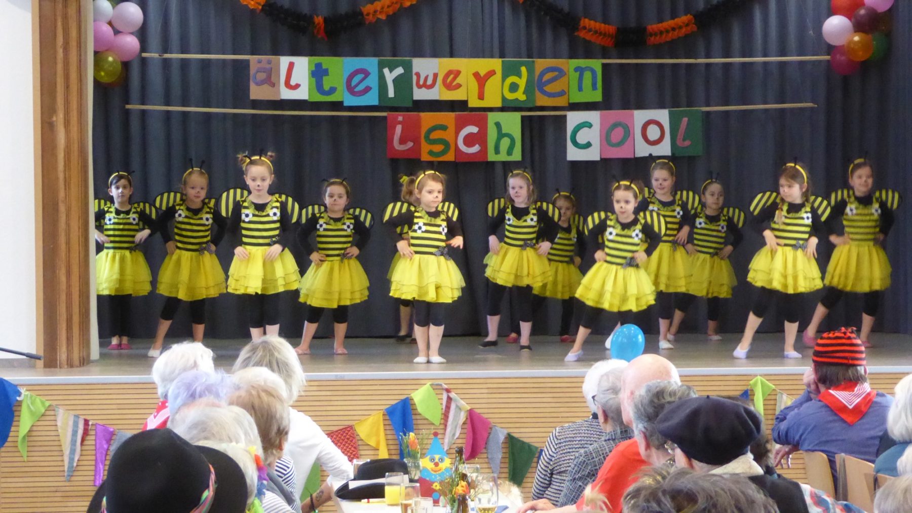 Nach der Kaffeepause sorgten wieder Gisela und Karl-Heinz mit bekannten Fasendliedern zum Singen und Schunkeln für Stimmung im Publikum. Der nächste Programmpunkt kündigte sich an, als 24 noch sehr sehr junge Tänzerinnen, angeführt von ihrer Choreografin Susi Dangl, in den Saal tänzelten. Eine Gruppe von Mädchen im Alter von 6 und 7 Jahren zeigten auf der Bühne zur Musik »Good to be alive« in wunderschönen Hippiekostümen eine gekonnte Tanzdarbietung, die sie nach Zugaberufen des Publikums gerne ein zweites Mal vorführten. Ganz entzückt waren die Seniorinnen und Senioren, als die 4- und 5-jährigen als Bienen gekleidet nach der Musik von Biene Maja einen eindrucksvollen Tanz auf die Bühne zauberten. Das begeisterte Publikum forderte eine Zugabe.