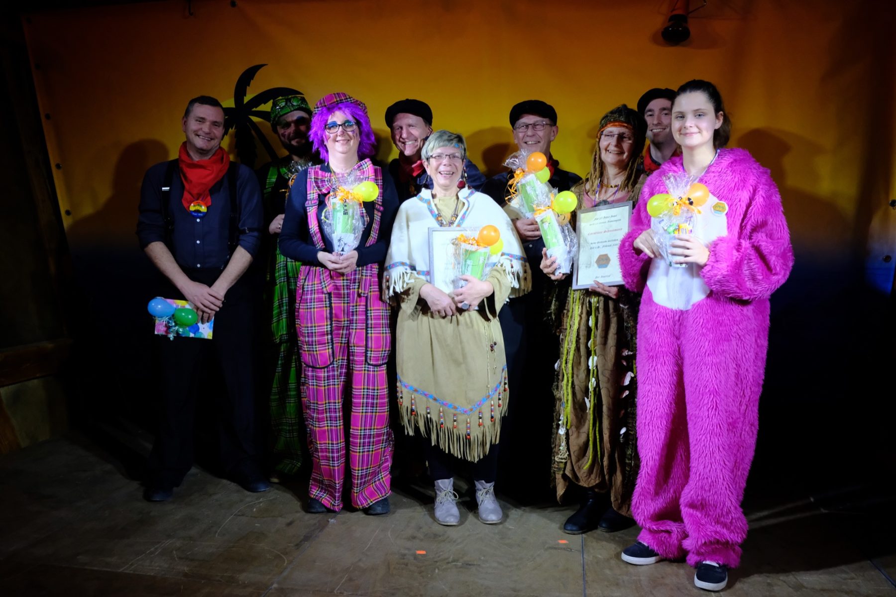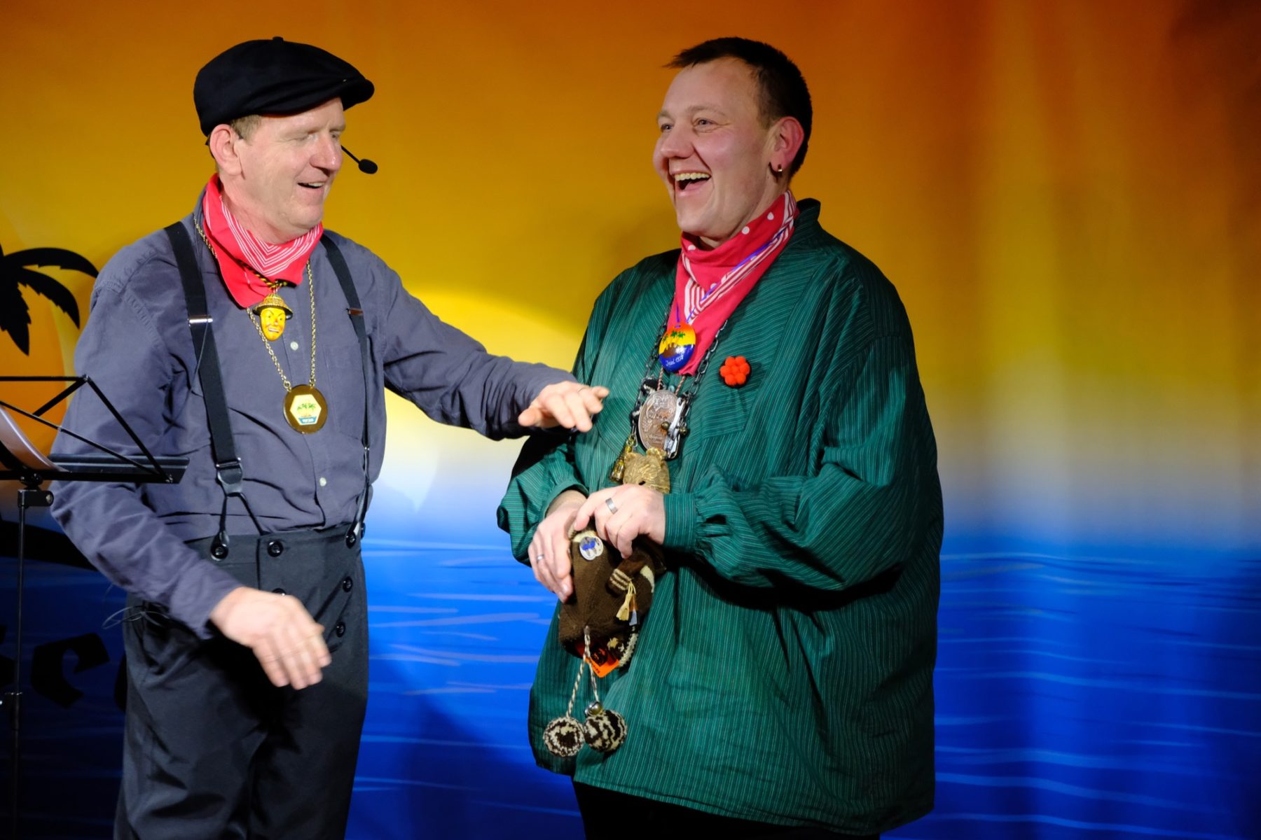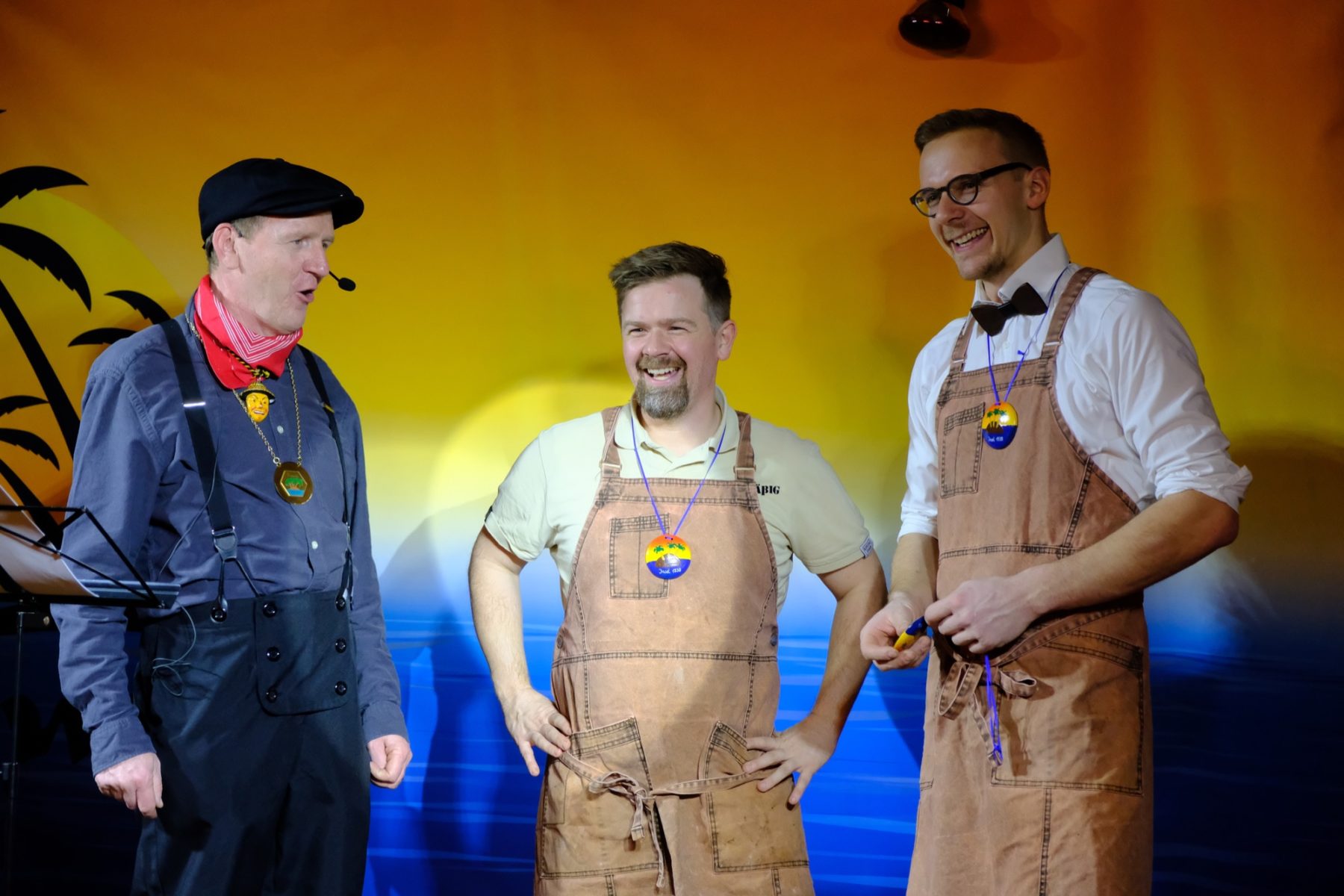 Bevor das Männerballett, in diesem Jahr unter der Firmierung »Kinzig Feet«, den Schlusspunkt setzten, war noch »Herr der Ringe« dran. Ein Kalauer, denn eigentlich tratschten auf der Bühne Heringe übers Insel-Leben. Über panisch in’s Kirchenasyl geflüchtete Klein-Pariser, den großen Insel-Hunger beim jährlichen Heringsessen, von Männern, die beim Kartenspielen Frau und Haus verzocken würden und Bart-Trends, die sogar den Hexen Angst machen. Das Publikum wurde eingebunden und durfte bei einem Rubbelgewinnspiel mitmachen. Der erste Preis war ein nigelnagelneuer Wäschetrockner, der sich als eine Packung Wäscheklammern herausstellte.
