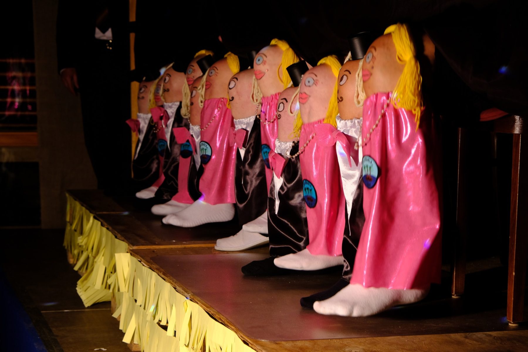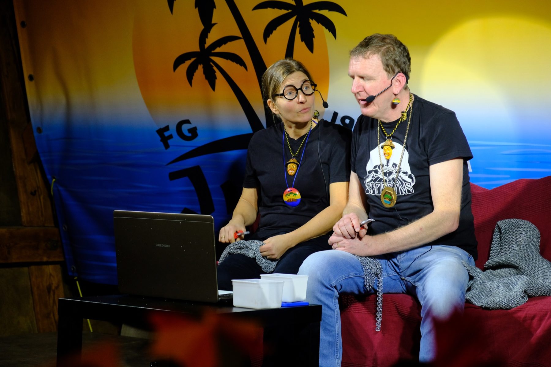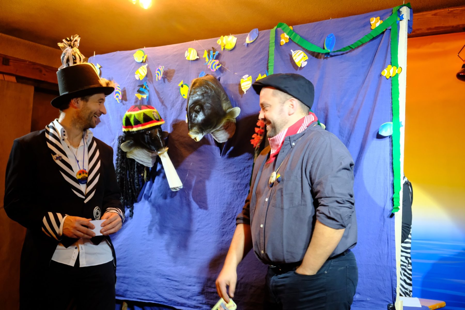 Bevor das Männerballett, in diesem Jahr unter der Firmierung »Kinzig Feet«, den Schlusspunkt setzten, war noch »Herr der Ringe« dran. Ein Kalauer, denn eigentlich tratschten auf der Bühne Heringe übers Insel-Leben. Über panisch in’s Kirchenasyl geflüchtete Klein-Pariser, den großen Insel-Hunger beim jährlichen Heringsessen, von Männern, die beim Kartenspielen Frau und Haus verzocken würden und Bart-Trends, die sogar den Hexen Angst machen. Das Publikum wurde eingebunden und durfte bei einem Rubbelgewinnspiel mitmachen. Der erste Preis war ein nigelnagelneuer Wäschetrockner, der sich als eine Packung Wäscheklammern herausstellte.