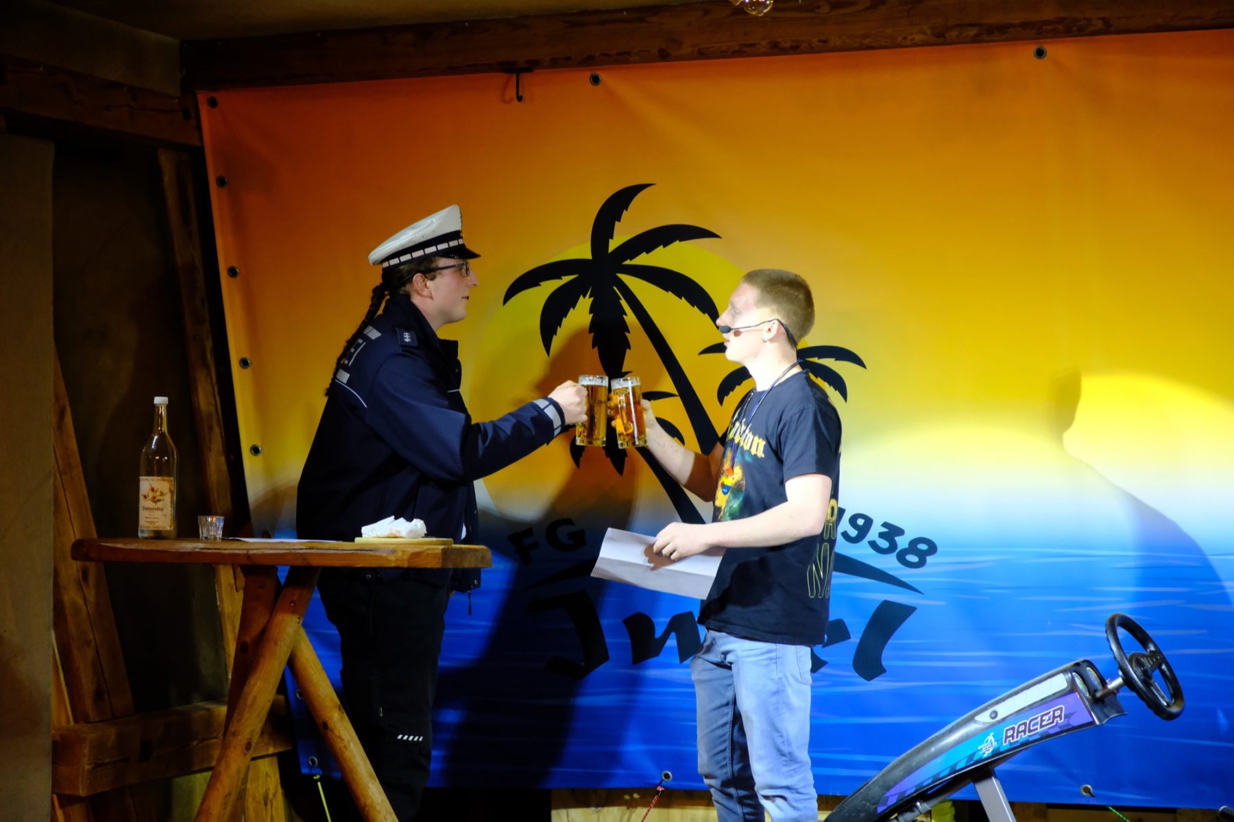 Das Programm spinnt – in diesem Jahr wieder 100 Prozent analog – ganz normale Alltagssituationen weiter. Was zum Beispiel, wenn man an der Fasend angehalten und gefragt wird, ob man etwas getrunken hat? Um diese Frage drehte sich der Sketch »Verkehrskontrolle im Städtle«. Die falscheste Antwort lautet in diesem Fall: Nichts! »Kein Mensch fährt an der Fasend nüchtern. Sie sind eine Gefahr für die anderen«, so die Belehrung des Polizisten auf der Tennen-Bühne. Damit der Führerschein trotzdem bleibt, muss der Kontrollierte eine dreistufige Fasend-Prüfung absolvieren: Trinken, Speck schneiden und Schnupftabak schnupfen. Verkehrte Welt – ein großer Spaß!