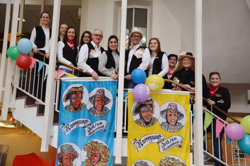 In der Kundenhalle grüßen die Zeller Narros und Sparkassen-»Zunftmeister« Jürgen Schmider (Mitte). Er und seine Zunftmitglieder schmücken sich über die närrischen Tage gerne mit Papierstreifen und Spielkarten ganz nach dem Sparkassen-Motto: »Fasend ist einfach – man muss nur mitmachen!« In diesem Sinne heißt es bei den närrischen Sparkässlern noch bis Aschermittwoch: »Hoorig isch die Katz!«