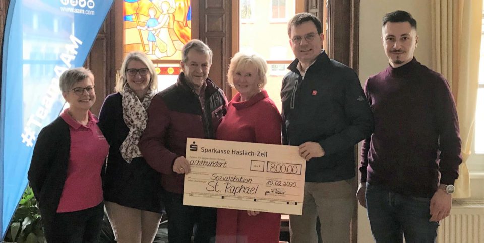 Am Montag, 10. Februar, konnte sich Herbert Vollmer, der Vorsitzende des Vereins Sozialstation St. Raphael e. V., freuen. Besuch hatte sich angekündigt und im Gepäck hatte dieser einen großen Spendenscheck. Dr. Dirk Landgrebe, Geschäftsführer der Firma AAM aus Unterharmersbach, überbrachte zusammen mit Petra Kramer, Personalleiterin und Burak Duran, stellvertretend für den Betriebsrat, einen Spendenscheck in Höhe von 800 Euro.