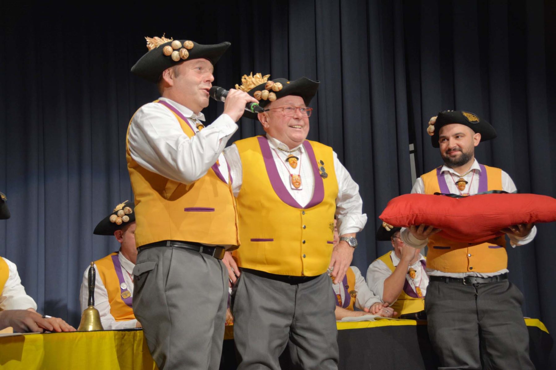 Mit närrischem Blick und spitzer Zunge hat auch der hochwohllöbliche Rat der Narrenstadt Zell die Schnitzer vom vergangenen Jahr aufgearbeitet. Nicht entgangen war den Räten, dass die Bewerbung von Neu-Stadtrat Jürgen Isenmann nicht im Briefkasten der Stadt, sondern im Kummerbriefkasten des Bürgermeister gelandet ist und so zur Chefsache wurde. Beim Jubiläumsbankett der Eckwaldhexen sollte der Zeller Ehrenzunftmeister als einer der drei »Gründungsmitglieder« geehrt werden, erhielt dann aber »die rote Karte«. Die ausstehende Ehrung holten die Zeller Narrenräte nach und überreichten Berthold Damm eine »goldene Hexenguf am Bande«.