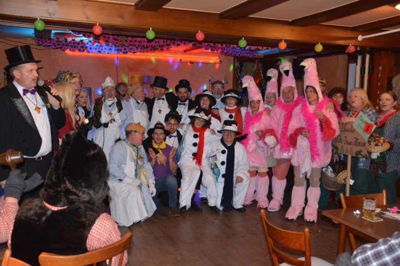 »Mir len’s schneien« versprachen die vier Schneemänner und luden das Publikum zum Schneesterne Basteln und zum Schlitttenfahren ein – wer mit wem Schlitten fuhr, konnte mit Spielkarten ausgelost werden. Aus der Schneekanone rieselten Konfetti-Flocken und auf der Unterschriftenliste »Future for Schneemänner und Schneefrauen« trugen sich neben Greta und einem Eisbären auch zustimmend die Besucher der Schnurrantennacht ein. Und weil Winter doch so schön ist, sangen, schunkelten und tanzten Schnurranten und Gäste gemeinsam den Schneewalzer. Die Schneemänner Marianne Burger, Marlene Kühnhanss und Gaby und Hanspeter Schwendemann wurden für ihre Idee mit dem ersten Platz belohnt.