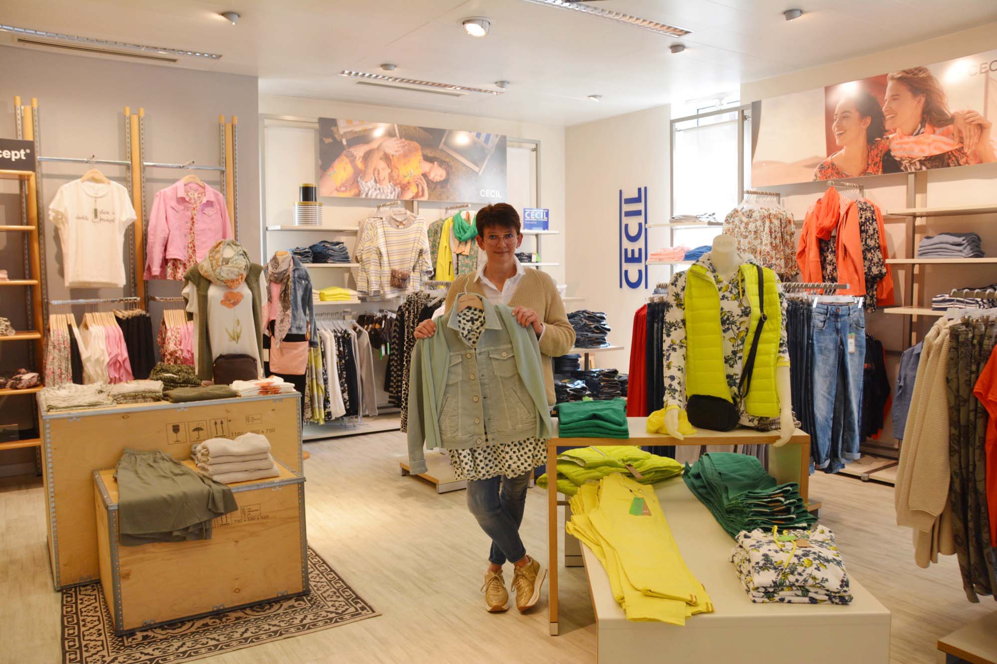 Der Saisonstart ist verschoben. Andrea Giesler vom Vorstandsteam des Handels- und Gewerbevereins inmitten von ihres großen Modehauses in der Zeller Oberstadt. Zumindest ein Teil der Waren soll trotz geschlossener Geschäfte über Bestell- und Lieferservice den Weg zur Kundschaft finden. Foto: Hanspeter Schwendemann