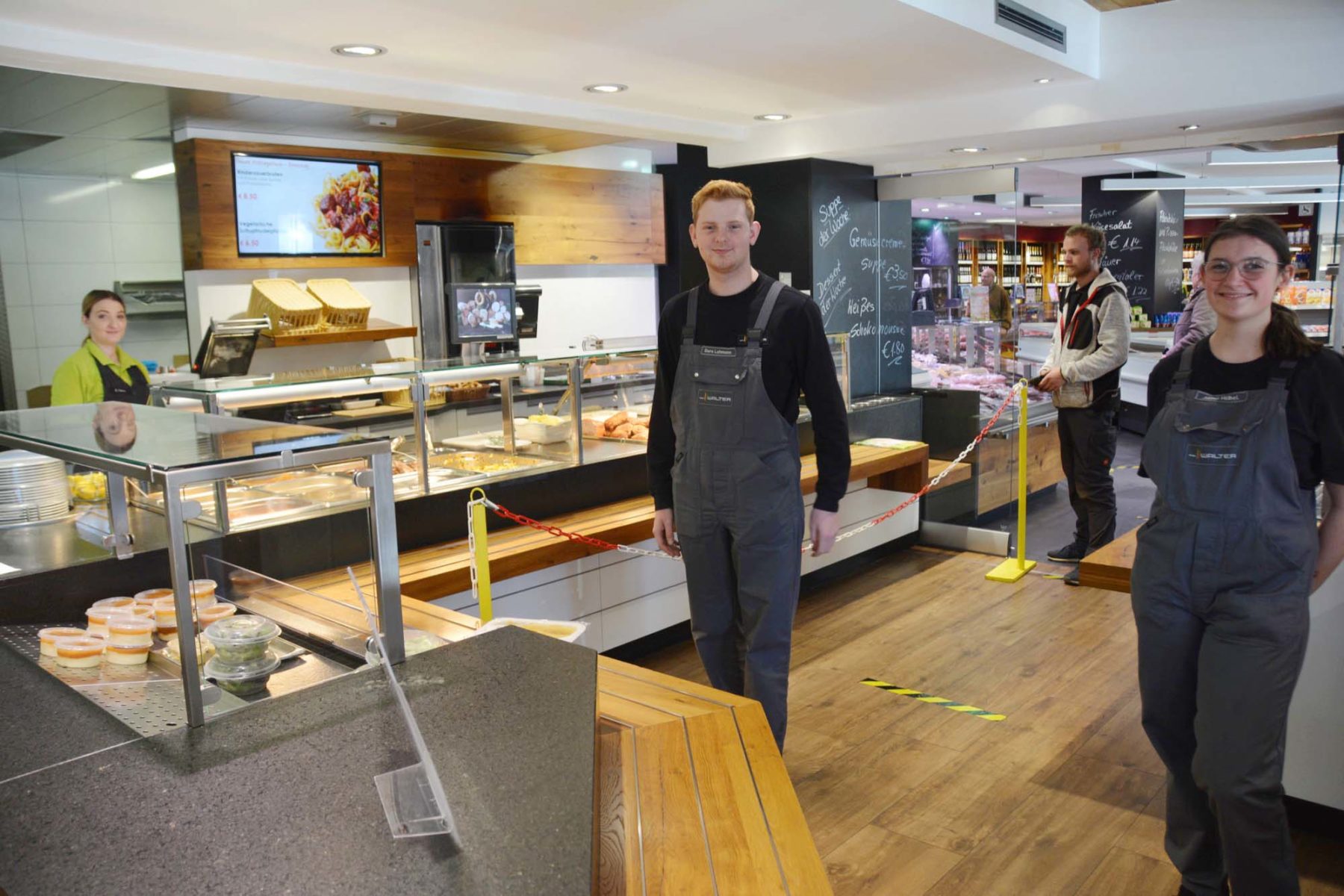 Abstand halten ist für die meisten Kunden, wie hier im Bistro der Metzgerei Wagner, zur selbstverständlichen Übung geworden.