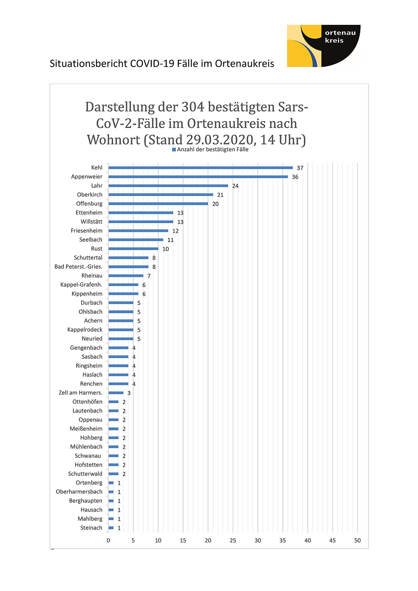 Die Fallzahl der bestätigten Corona-Infizierten im Ortenaukreis erhöht sich am Sonntag um weitere 32 Personen auf nun 304. In Zell am Harmersbach gibt es inzwischen drei bestätigte Corona-Fälle. In Oberharmersbach einen Fall. Die Orte Nordrach und Biberach tauchen weiterhin nicht im Situationsbericht des Landesgesundheitsamtes auf.