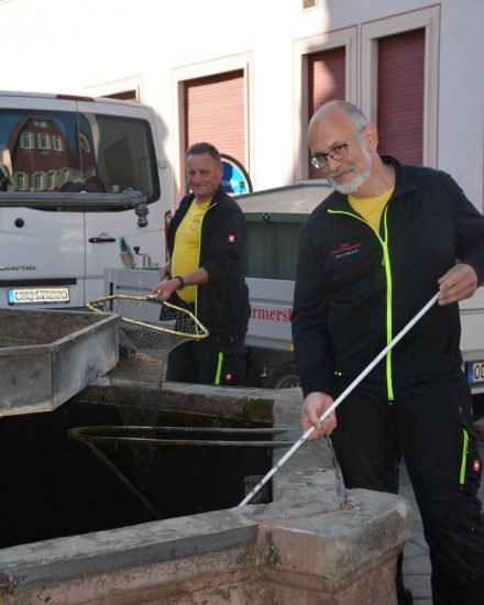 Mit der Umsiedlung betraut waren Fritz Vollmer und Martin Hug. Erstgenannter kümmert sich schon seit über 35 Jahre um den Brunnen und seine schuppigen Hausgäste. Erst als Mitarbeiter im Betriebshof, später dann ehrenamtlich. »Ich hab mich so lange um den Brunnen gekümmert, dann hab ich das einfach weitergemacht, als ich in den Ruhestand ging«, berichtet Vollmer, der damit quasi eine Art »Brunnenpate« ist.