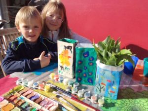 Linus und seine Schwestern Lotta und Luisa machen Upcycling und basteln und verzieren Blumenübertöpfe und Vasen aus alten Getränkekartons.