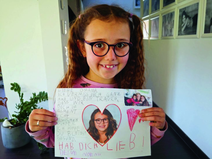Noemis Uroma wohnt im Seniorenheim St. Gallus in Zell. Dort herrscht seit letzter Woche absolutes Besuchsverbot. Da wir sie also zur Zeit nicht sehen können und sich unser Kontakt auf die wenigen Male beschränkt, in denen eine Mitarbeiterin des Heims ihr eigenes Handy benutzt, um uns per Whats­app-Videoanruf mit ihr zu verbinden, haben wir beschlossen, ihr wenigstens ab und zu einen Brief zu schreiben. Darüber freut sie sich wahnsinnig. Auch Noemi hat jetzt ihren ersten Brief an ihre Uroma gestaltet und selbst geschrieben. Vielleicht ist das ja auch eine Idee für alle Kinder, die im Moment ihre Großeltern oder sogar Urgroßeltern nicht besuchen dürfen. Foto: privat