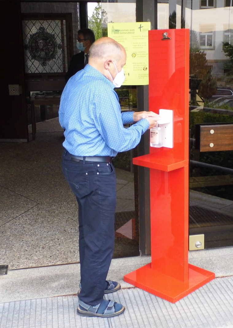Erst nach der Händedesinfektion konnte die Kirche betreten werden. Das Befolgen der Hygieneregeln war für die Gottesdienst­besucher selbstverständlich.