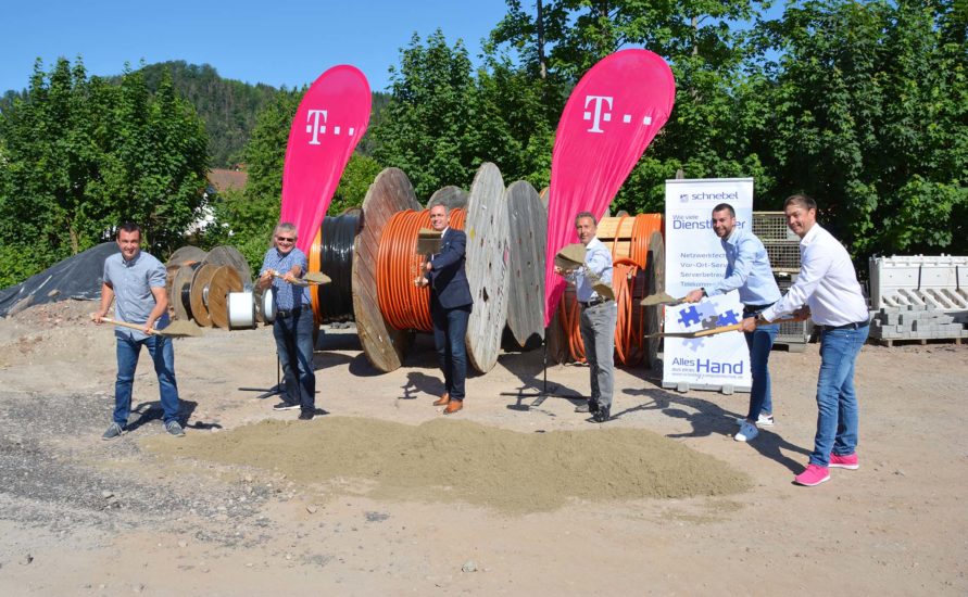 Mit dem offiziellen ersten Spatenstich hat heute der Glasfaserausbau der Firma Telekom im Gewerbegebiet Steinenfeld begonnen. Die Glasfaserkabel werden direkt an die Unternehmensstandorte verlegt. Rund 110 Firmen haben ab dem Jahresende die Möglichkeit, mit hohen Geschwindigkeiten ihre Daten aus dem Netz herunterzuladen und zu versenden.