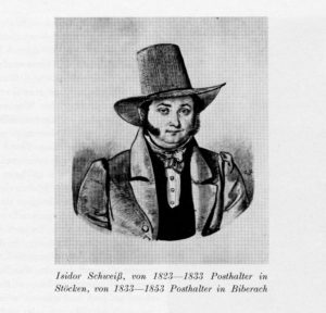 Ab 1823 amtiert Isidor Schweiß als Posthalter in Stöcken. Seine eigenwillige Amtsführung hat ihm den Beinamen »Postpascha« eingebracht. Den Pfarrer und Heimatschriftsteller Hansjakob reizte es, das Original in seine Erzählungen aufzunehmen. Das Gasthaus »Rebstock« zeigt in seiner Stube stolz das Portrait des populären Postlers. Immerhin muss er sich in seinem Metier bewährt haben. Als 1829 die Poststation nach Biberach in das Gasthaus »Sonne« verlegt wurde, wurde er auch dort Chef im Amt.