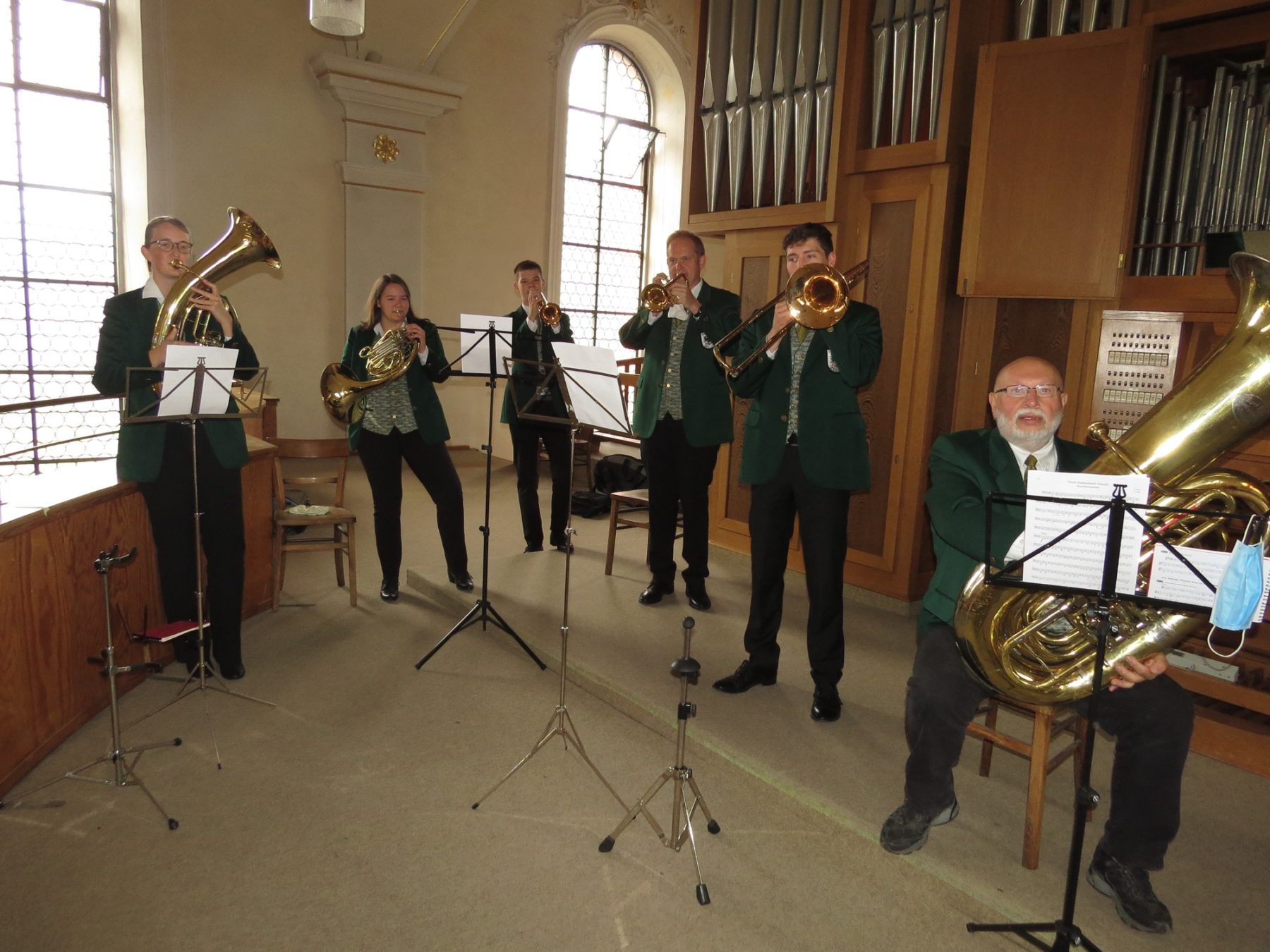 Stefan Polap kam mit einem kleinen Ensemble der Stadtkapelle aus fünf Musikern, um mit Sicherheitsabstand musizieren zu können. Mit dem bekannten »Ode an die Freude« von Ludwig von Beethoven begrüßten die Bläser die Kirchenbesucher zu Beginn der Feier. Im liturgischen Ablauf begleitete das Ensemble die Lieder der Gemeinde. Organist Dieter Benson spielte die festliche Orgelmusik.