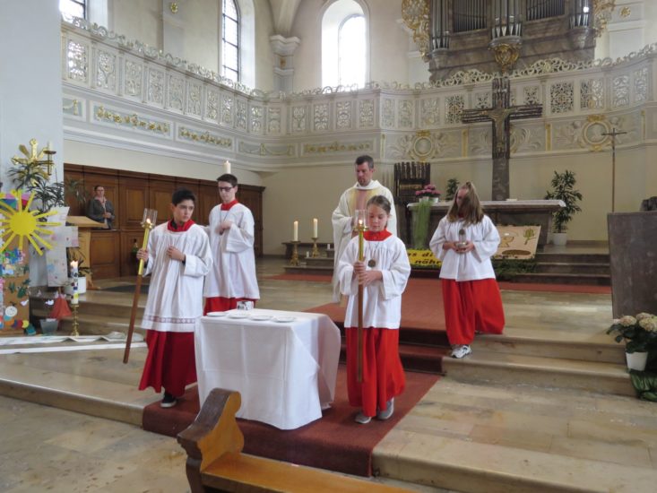 Am Ende der Feier bedankte sich Pater Christoph für die Vorbereitung und Gestaltung der Feier bei dem Liturgiekreis und dem Gemeindeteam, den Ministranten und Lektoren sowie den Musikern der Stadtkapelle und dem Organisten. Der spontane Applaus der Gemeinde drückte ebenfalls Dankbarkeit aus und zeigte, dass die Feier allen gefallen hat.