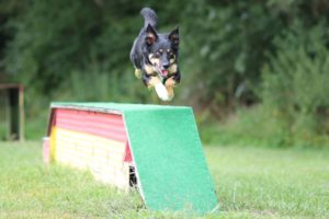 Beim Turnierhundesport absolvieren die Teams eine 75 Meter lange Sprintstrecke, auf der der Hund acht Hindernisse zu absolvieren hat. Sammy (im Bild) und Kim wurden letztes Jahr Kreismeister im THS.