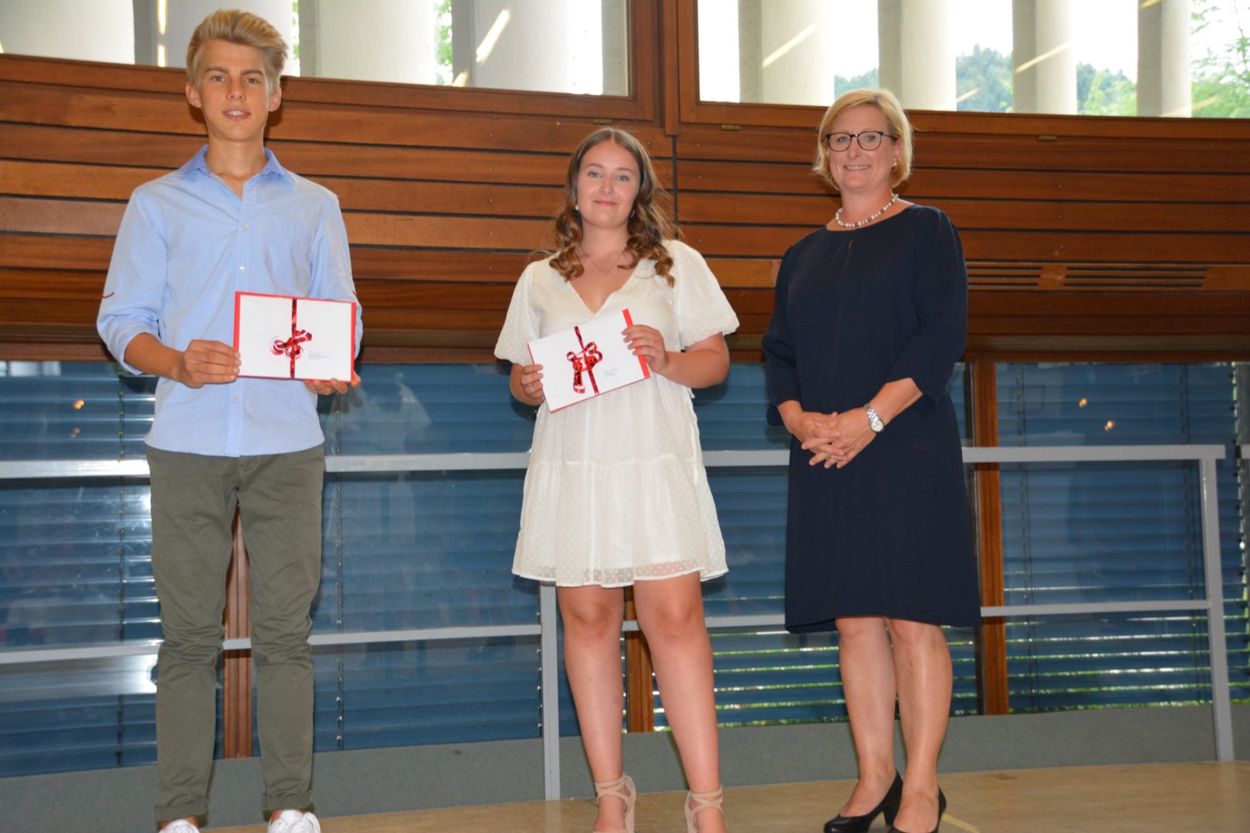 Mit einem Lob für besondere schulische Leistungen geehrt wurden: Kim Lehmann (1,7) und Katrin Muser (1,5), beide Klasse W9; in der R 10a: Nora Pfaff (2,0), Mara Benkisser (1,9), Eveline Sukowski (1,9) und Marina Lehmann (1,8); in der R10b: Nelinee Schäfer (2,0), Max Zimmermann (2,0), Luis Lehmann (2,0), Jonas Dorner (2,0), Elias Armbruster (1,9), Luca Hermann (1,6) und Franziska Schmieder (1,6).