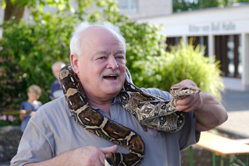 »Ich möchte andere teilhaben lassen an meiner Freude«, strahlte der Jubilar bis über beide Ohren mit der Sonne um die Wette. Er sei sich sicher, dass alles mehrfach zurückkommt, wenn man anderen eine Freude macht, erklärt er seine Motivation. Eine Einstellung, von der die Stadt immer wieder profitiert. Die Schlangen mit ihrer Tänzerin waren nicht das erste Showhighlight, das er zu einem seiner Geburtstage eingeladen hatte. Auch Box-Legende Rene Weller war schon früher einmal dagewesen, ein anderes Mal hatte eine begnadete Hula-Hoop-Tänzerin die Hüften kreisen lassen.
