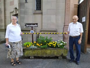 Foto: Hans-Peter WagnerRosa-Maria und August Uhl zeigen mit dem Maßstab am Beispiel des Blumentroges den einzuhaltenden Abstand von 1,50 Meter die Besucher der Gottesdienste des hohen Festtages. Natürlich dürfen Familien und alle die zusammengehören auch beim Gottesdienst zusammenbleiben.