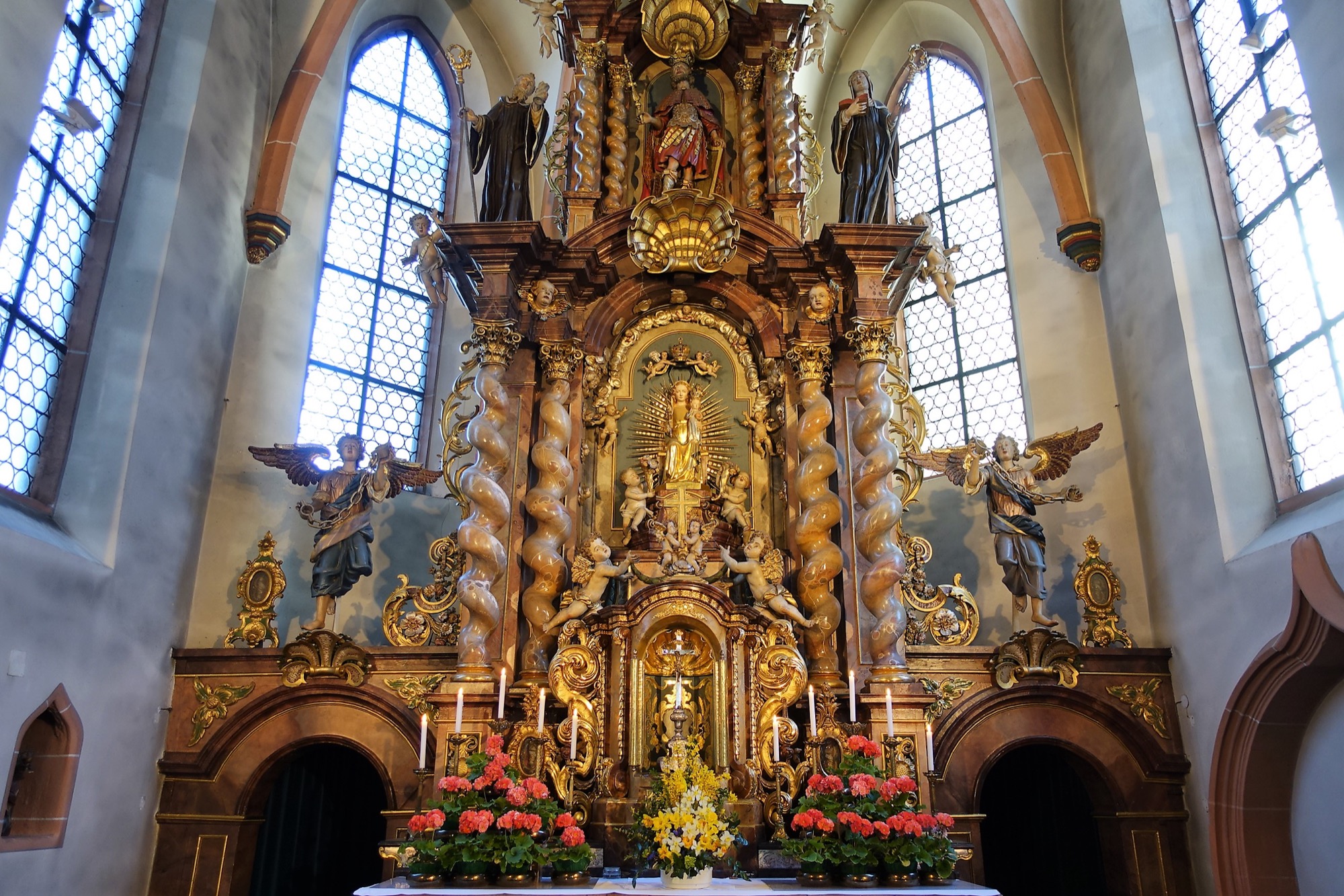 Foto: Bruder Berthold OehlerFestlich geschmückt ist am höchsten Festtag der Hochaltar im Vorraum der Wallfahrtskirche. Er wurde im Baustil der Gotik (1250 – 1530) errichtet. Im Mittelpunkt des Altaraufbaues befindet sich das Gnadenbild, das Maria sitzend mit Jesus auf dem Schoß zeigt. In ihrer rechten Hand trägt Maria das Zepter als Herrscherin, während Jesus als Königssohn den Erdball in seiner Hand hält und ihn segnet. Das aus Lindenholz geschnitzte Gnadenbild ist noch älter als die Kirche selbst. Es stammt aus der Zeit der Romanik (950 – 1200), denn in der nachfolgenden Zeit der Gotik wurde die Gottesmutter Maria immer stehend dargestellt.