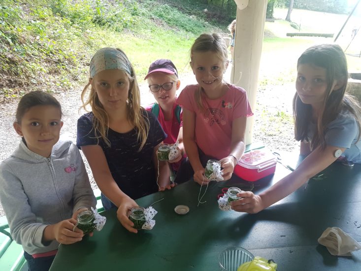 Dann machte sich die Gruppe auf, um heimische Wildkräuter in Wald und Wiese zu sammeln. Sieben verschiedene Kräuter wurden dann nach und nach entweder zu Kräutersalz zermörsert oder als selbstgemachte Kräuterbutter mit Brot gevespert. So gestärkt hörten die kleinen Kräuterhexen zum Abschluss noch ein zauberhaftes Kräutermärchen und konnten unter Anleitung von Christina Maier eine eigene Spitzwegerichsalbe ansetzen.