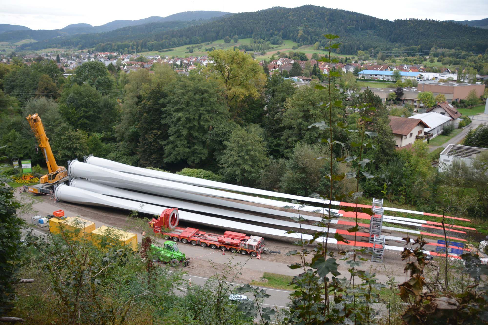 Nachdem die ersten Termine für die Transporte aufgrund technischer Probleme verschoben werden mussten, zeigt sich der Projektträger badenova nun optimistisch, dass in der kommenden Woche mit den Transporten begonnen werden kann. Wenn alles glatt läuft und auch das Wetter mitspielt, könnte das erste Rotorblatt am frühen Dienstagmorgen seinen Weg zum Windpark Hohenlochen aufnehmen. Daumen drücken: Starken Wind kann das Projekt – zumindest im Moment – gar nicht gebrauchen.