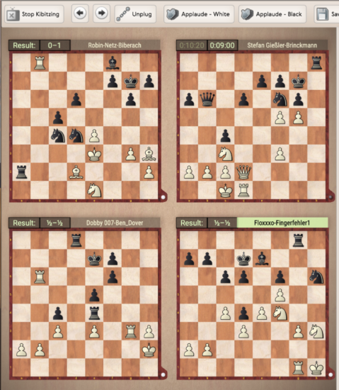 Besonders Stefan Rechlin war betroffen. Die Figuren auf seinem Brett ließen sich an seinem Rechner nicht bewegen, doch seine Uhr lief gnadenlos weiter. Telefonische Rücksprachen mit den Technikern halfen nicht. Erst der Versuch am Smartphone weiterzuspielen, führte zum Erfolg. Mit deutlichem Zeitrückstand und kritischer Stellung war er in schlechterer Position. Es gelang ihm in ein Turmendspiel abzuwickeln, in welchem weder Weiss noch Schwarz Gewinnversuche un­ter­nehmen konnte ohne selbst in Gefahr zu geraten.
