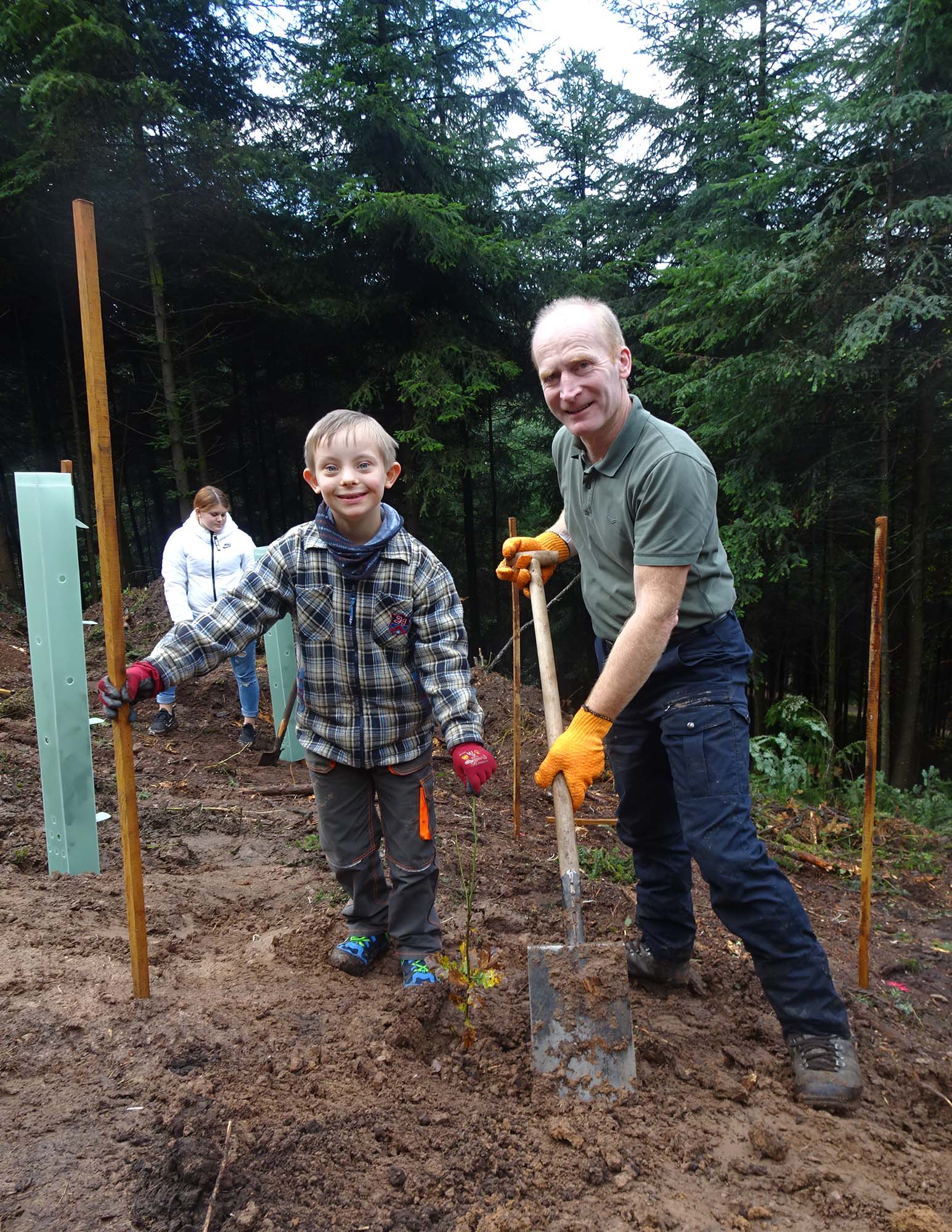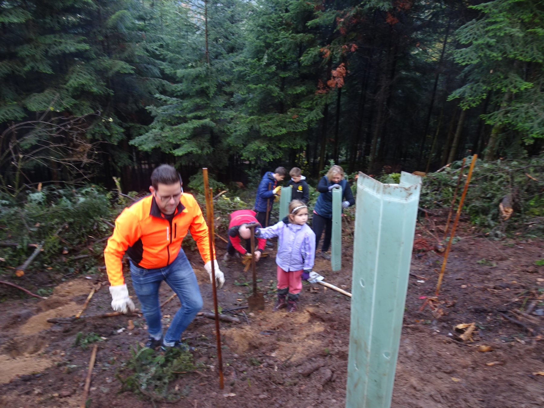 Förster Klaus Pfundstein und Forstbezirksleiter Simeon Springmann, vom Amt für Waldwirtschaft, haben die fachliche Anleitung übernommen und die Vorgehensweise beim Bäume pflanzen gezeigt und erklärt. Jedes »Bäumchen« braucht für seinen Standort ein 30 bis 40 Zentimeter tiefes Loch im Waldboden, genug Erde und Platz – also Abstand zu anderen Bäumen. Mit einer sogenannten Wuchshülle versehen ist jedes Bäumchen vor Wild-Verbiss geschützt und für Pflegearbeiten leicht auffindbar.