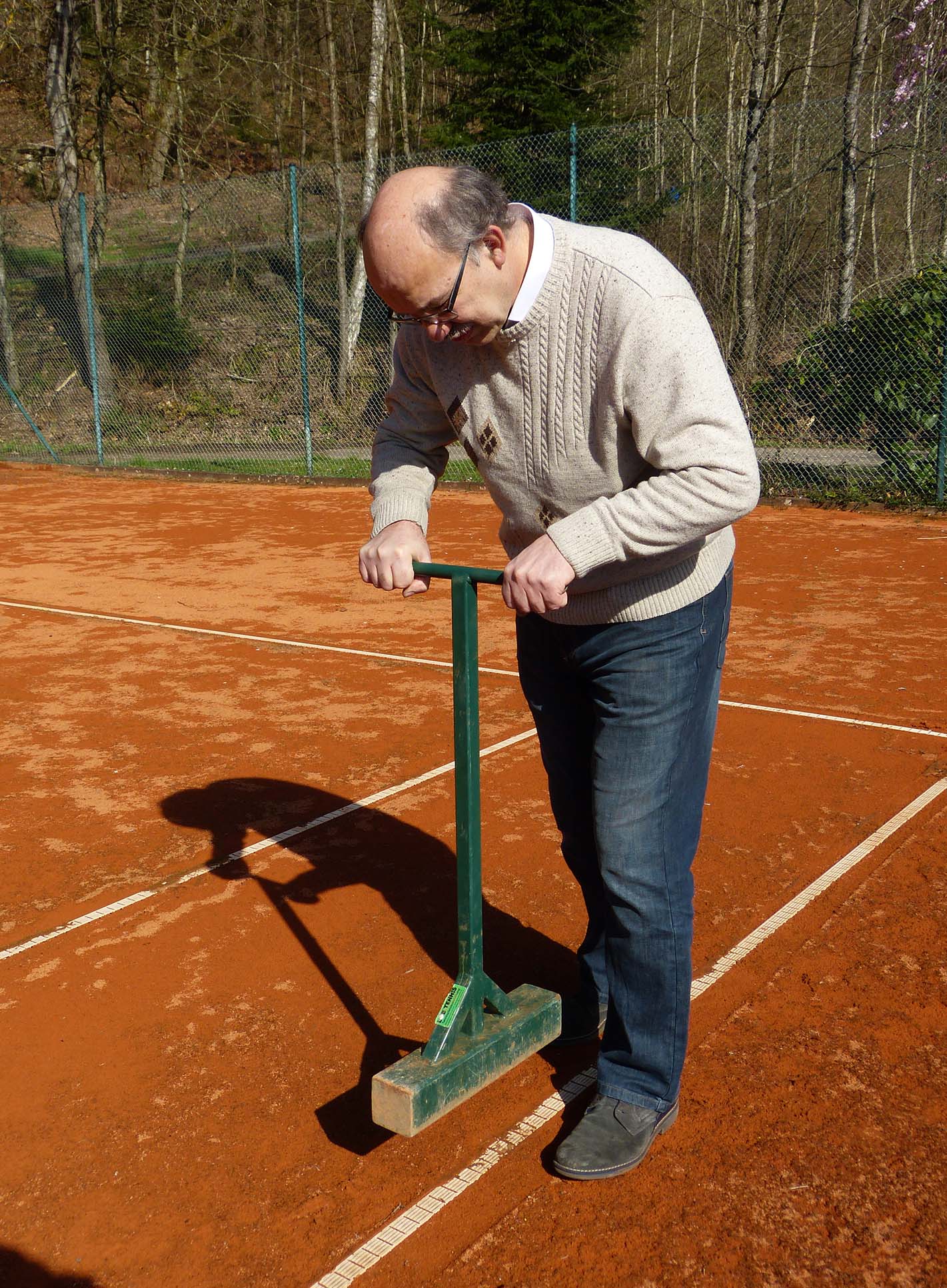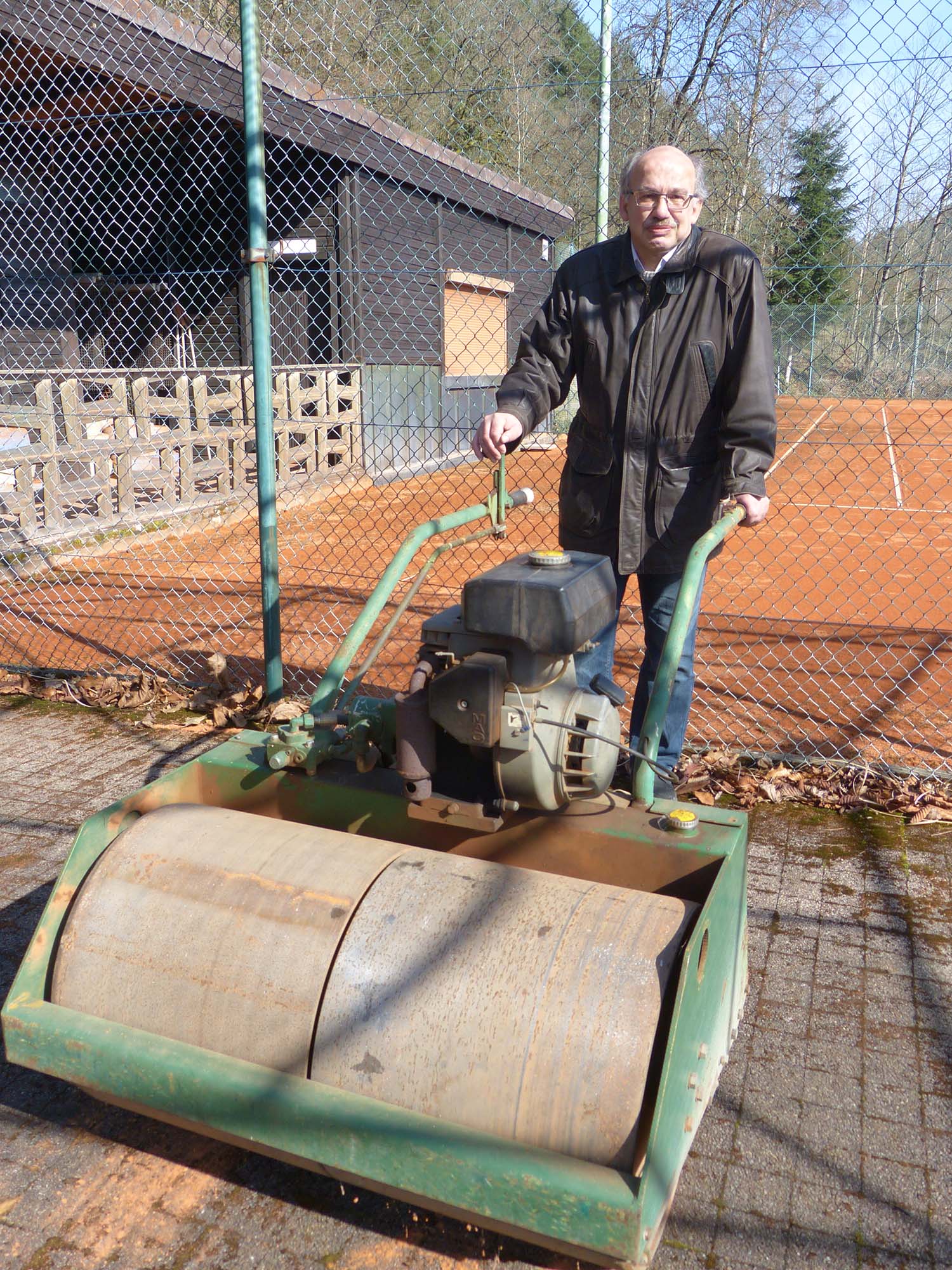Anschließend ist die Arbeitskraft des unermüdlichen Platzwarts gefragt. Denn nun müssen alle sechs Plätze durchdringend gewässert, sprich eingeschlämmt, und mindestens einmal längs sowie einmal quer mit einer benzinbetriebenen 350-Kilo-Walze behandelt werden, »damit alles wieder fest wird.«